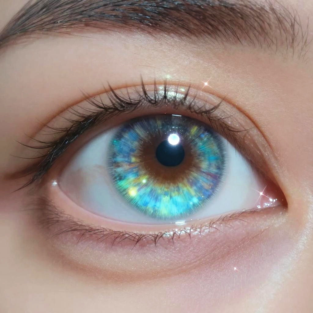 Eye color changer depicted as a magical glowing orb hovering over an eye, vivid colors swirling and shifting seamlessly from brown to bright turquoise, fantasy style with ethereal light, delicate sparkles, close-up portrait with enchanting mystical vibes.