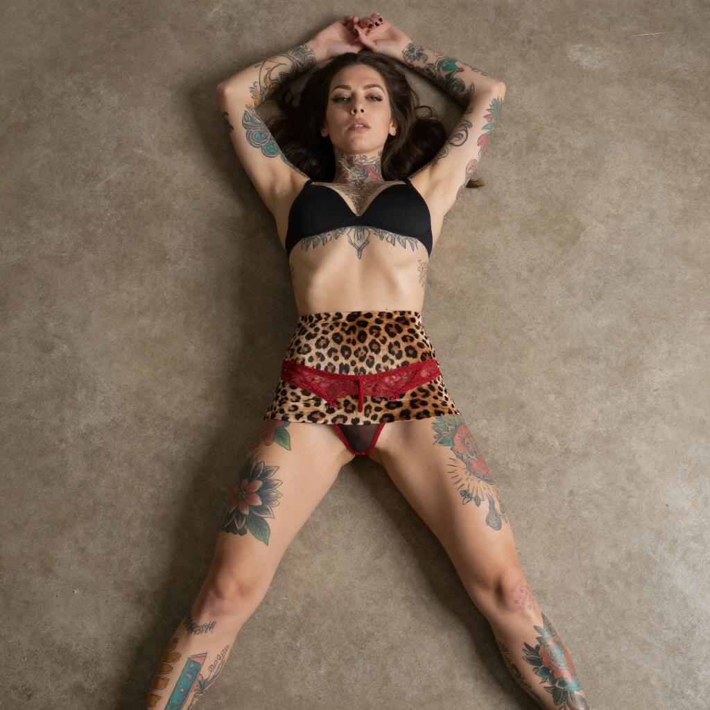 Photograph of a heavily tattooed woman lying on a rough, concrete floor. She has dark hair, wears a black bra and red lace panties, and a leopard-print skirt. Her arms and legs are spread out, showcasing intricate, colorful tattoos covering her entire body. Her expression is relaxed, eyes closed.