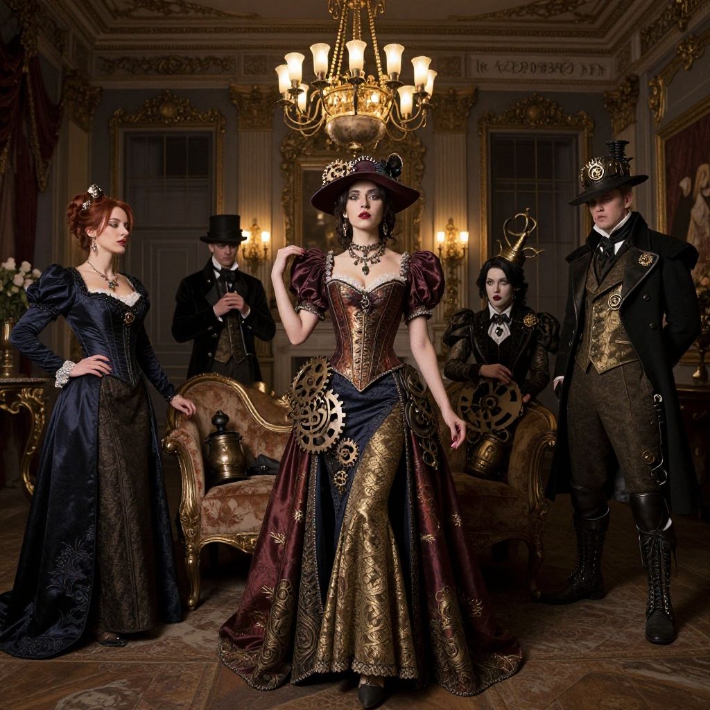 Photorealistic Images: {Within the opulent halls of a Victorian steampunk mansion, Druna draped in luxurious fabrics and intricate gears mingle with characters from the seedy underbelly of society. The clash of high society and street culture is palpable as models strike poses amidst grand chandeliers and ornate furnishings, juxtaposed against dimly lit corners and hidden passages. Capture the drama and intrigue of this conflicted world, where appearances often deceive and alliances are forged in secrecy.}, Victorian Steampunk Mansion, Luxurious Fabrics, Intricate Gears, High Society Characters, Seedy Underbelly, Grand Chandeliers, Ornate Furnishings, Drama and Intrigue, Conflicted World, (High Society Drama:1.2), (Hidden Passages:1.1), (Street Secrets:1.1), (Druna by Milo Manara:1.2), steampunk_costume, corset
