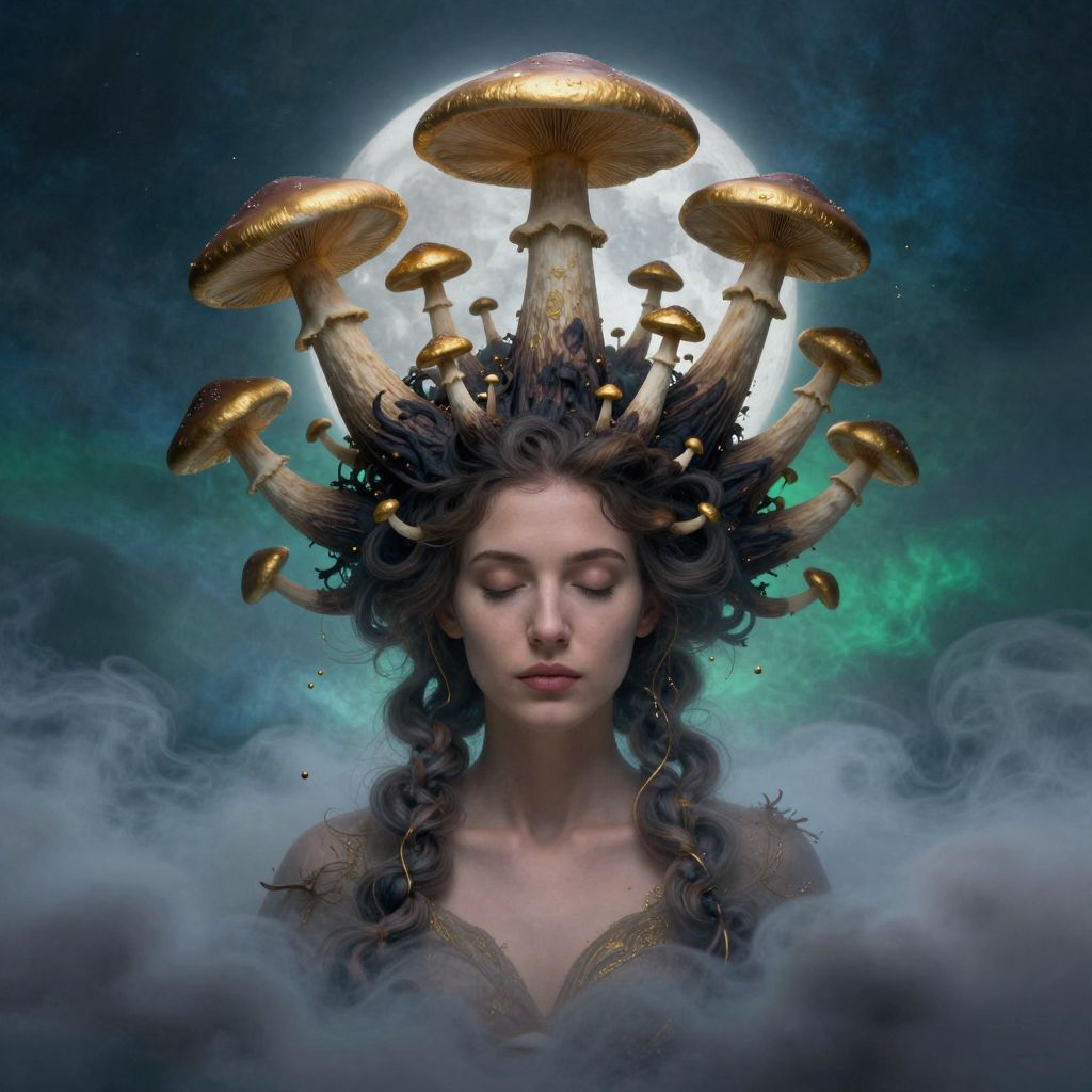 Digital artwork of a pale-skinned, ethereal woman with long, curly dark hair. She wears a crown of golden mushrooms, each with varying sizes, extending from her head. Her eyes are closed, and she has a serene expression. She is dressed in a dark, ornate garment. The background features a glowing full moon and a misty, smoky atmosphere with blue and green hues. The overall style is fantasy with a surreal, mystical vibe. The mushrooms and mist add a magical, otherworldly element to the composition.