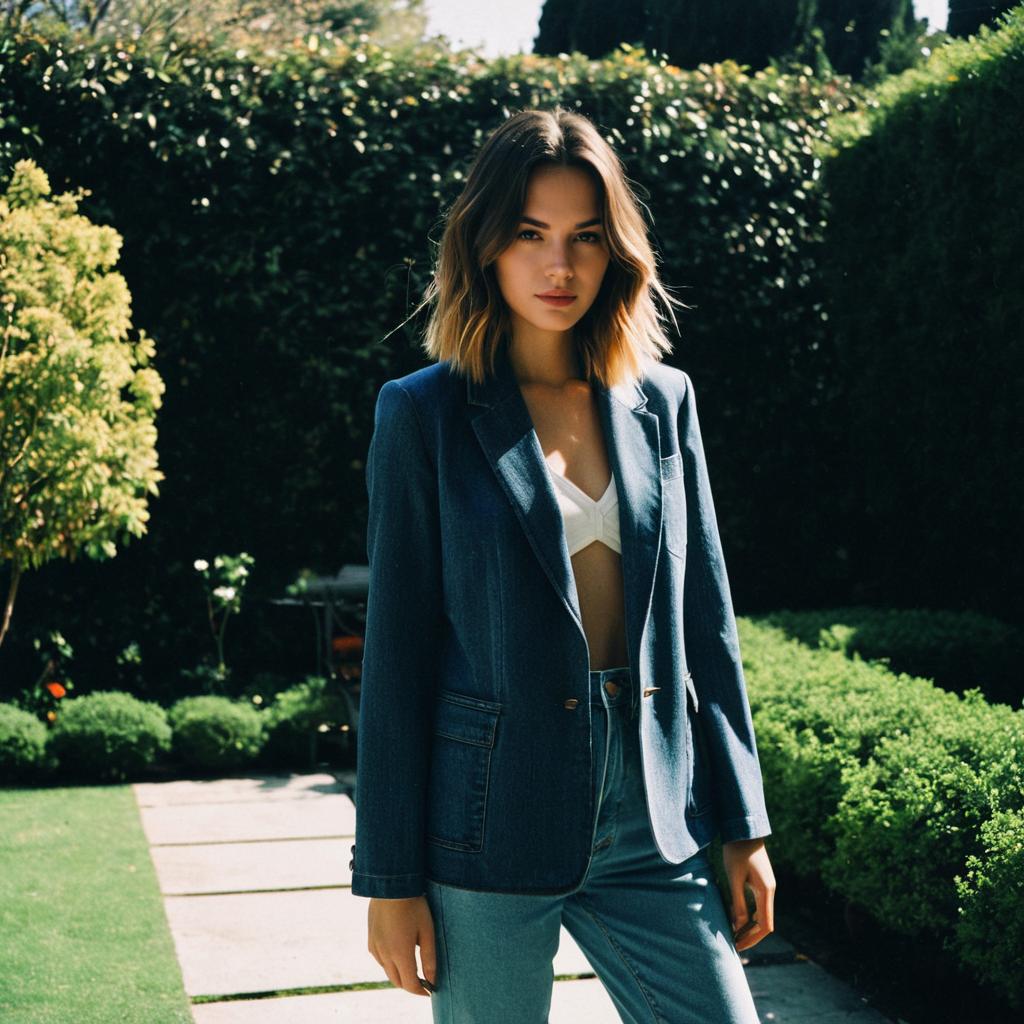 Shadow Fade hairstyle on fashion model, wearing casual blazer and jeans, in garden terrace, captured in fashion editorial style with dramatic contrast.