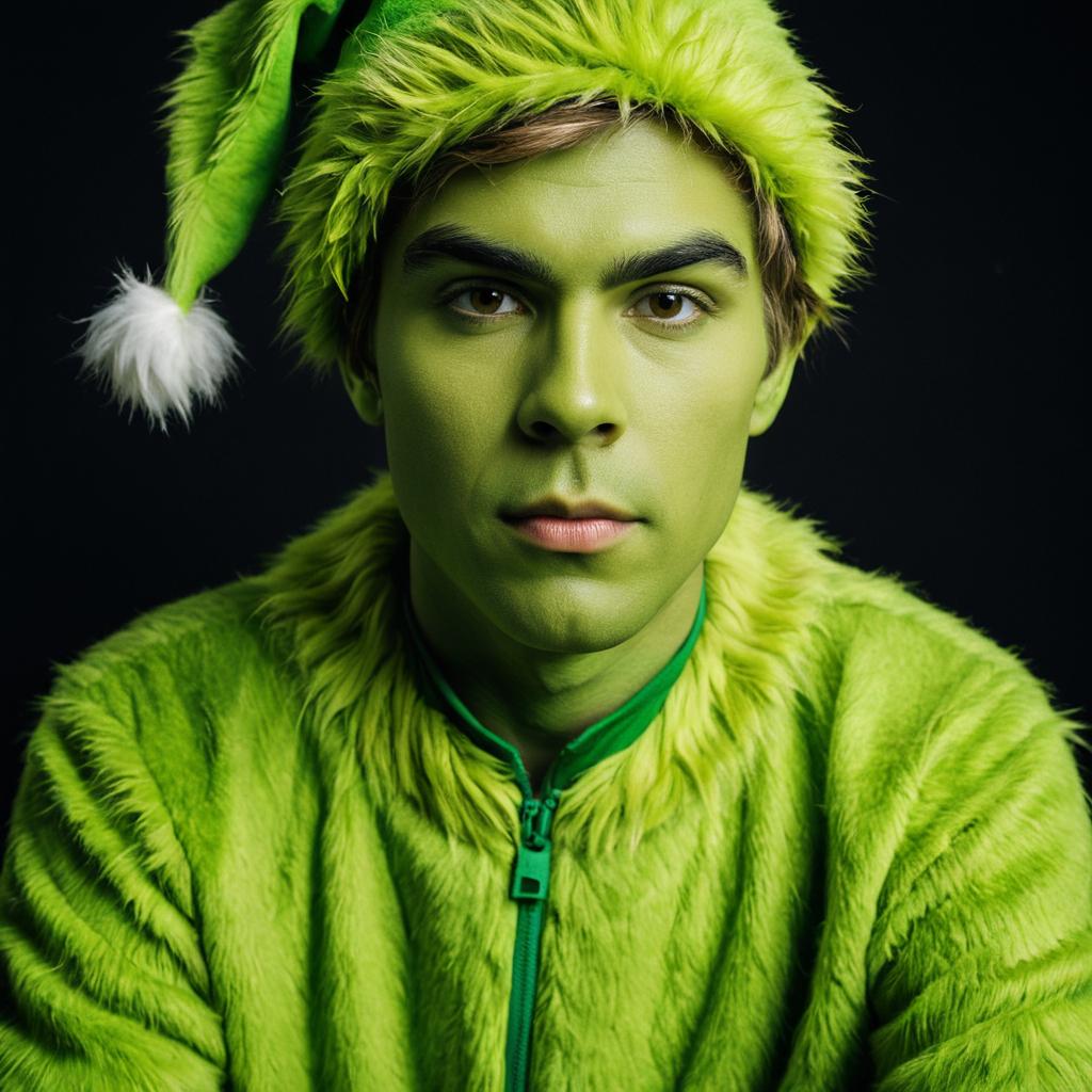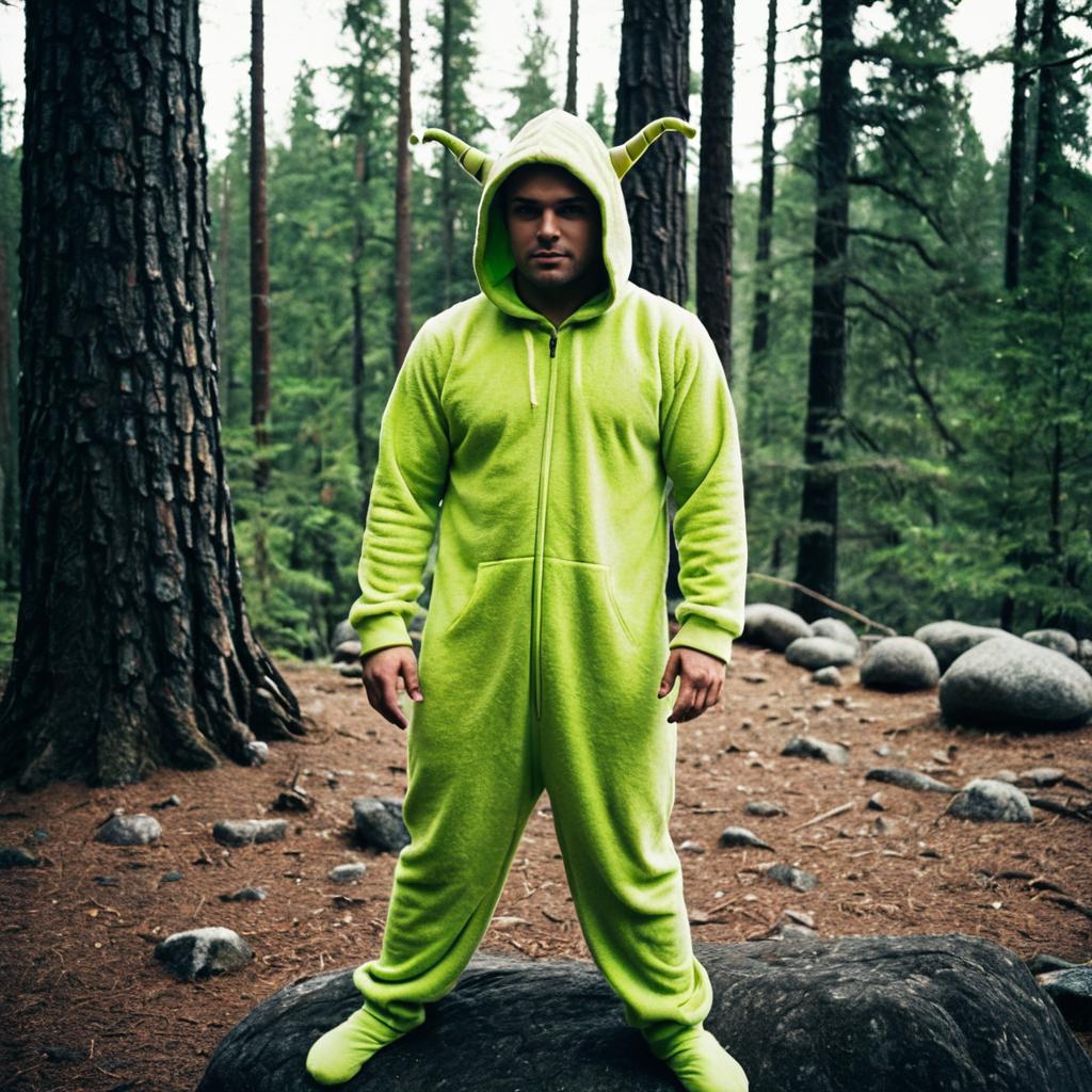 Shrek onesie man costume,1boy, male focus, solo, antennae, bald, nature, outdoors, rock, realistic, forest, standing, alien, tree, full body, looking at viewer, hood
