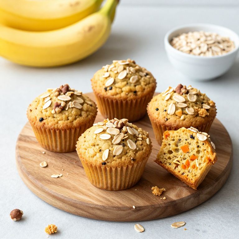 Golden banana carrot oat muffins, topped with scattered oats and crushed nuts, rest on a rustic round wooden board, surrounded by a few crumbs and garnished with a halved muffin revealing its moist interior, all set against a light gray surface with bananas and a small bowl of oats in the background.