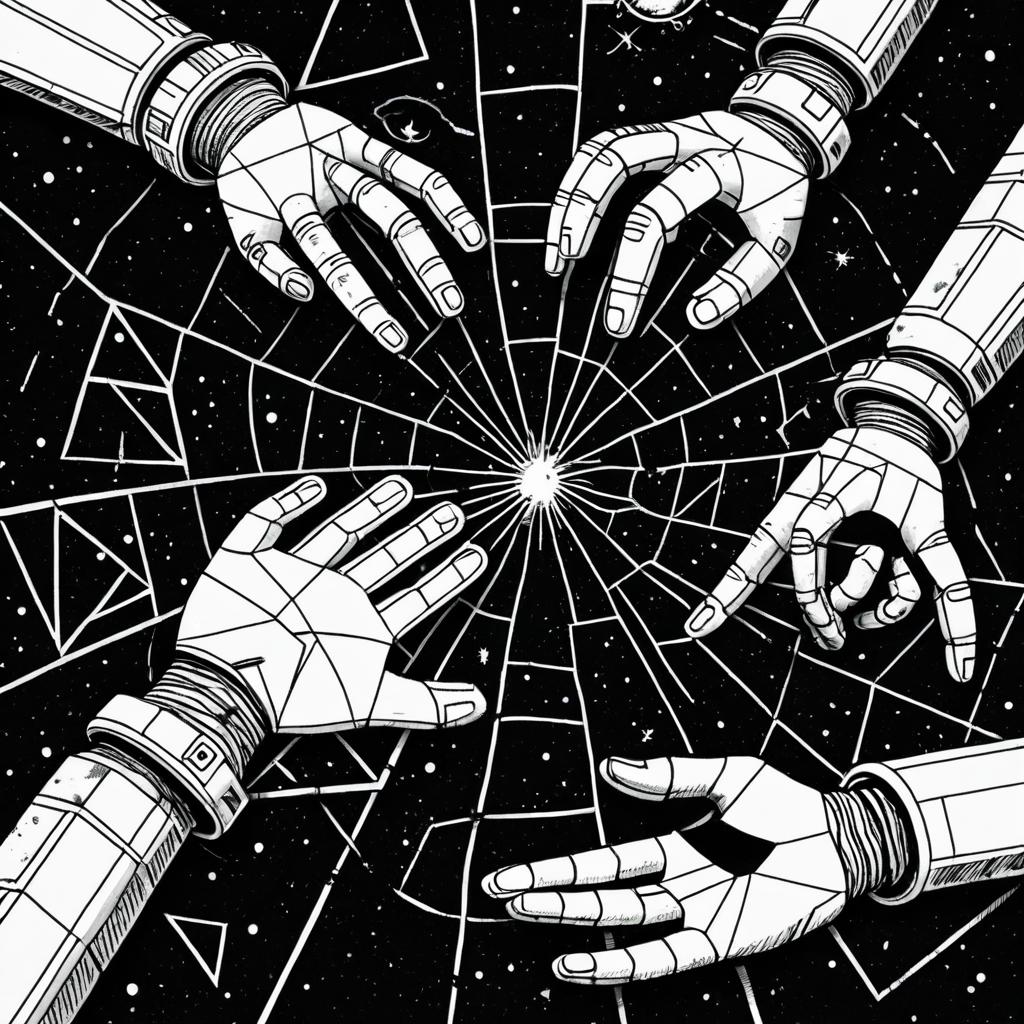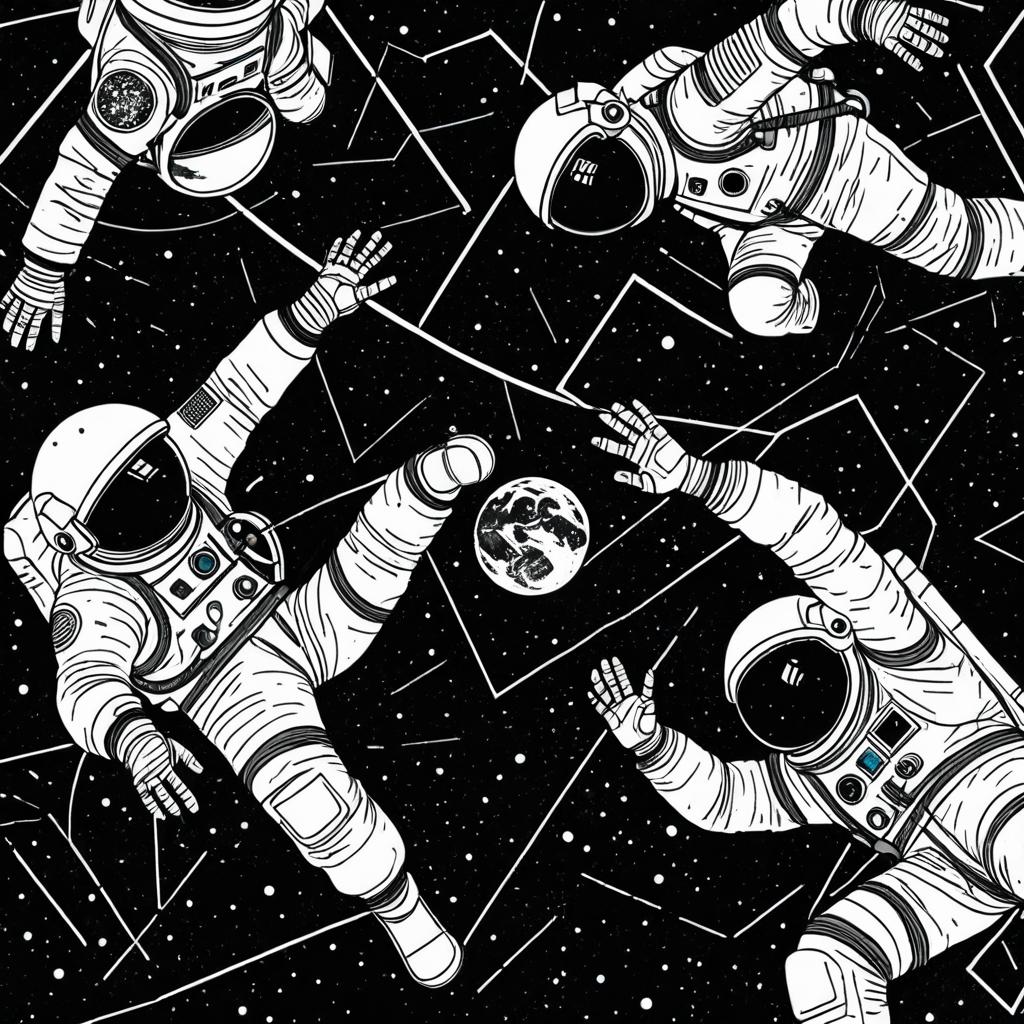 Detailed black and white illustration of three astronauts floating in outer space with geometric moon phases and distant stars. The astronauts wear classic space suits with visible USA patches and tether cables, depicted in a brutalism-inspired, mixed media style with paper cutouts and distressed textures. Distorted arms with mangled fingers emerge from the dark background, reaching towards the astronauts, enhancing the surreal and dynamic composition.