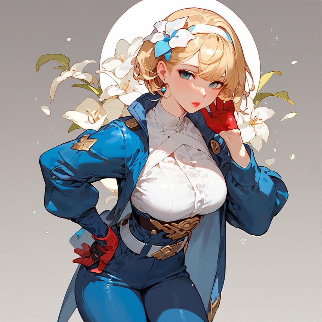 Score_9, score_8_up, score_7_up, source_anime, solo, 1girl, pokemoncarmine, expressionless, looking at viewer, hand on hip, mole under eye, hairband, blue jacket, long sleeves, red gloves, single glove, blue pants, white belt