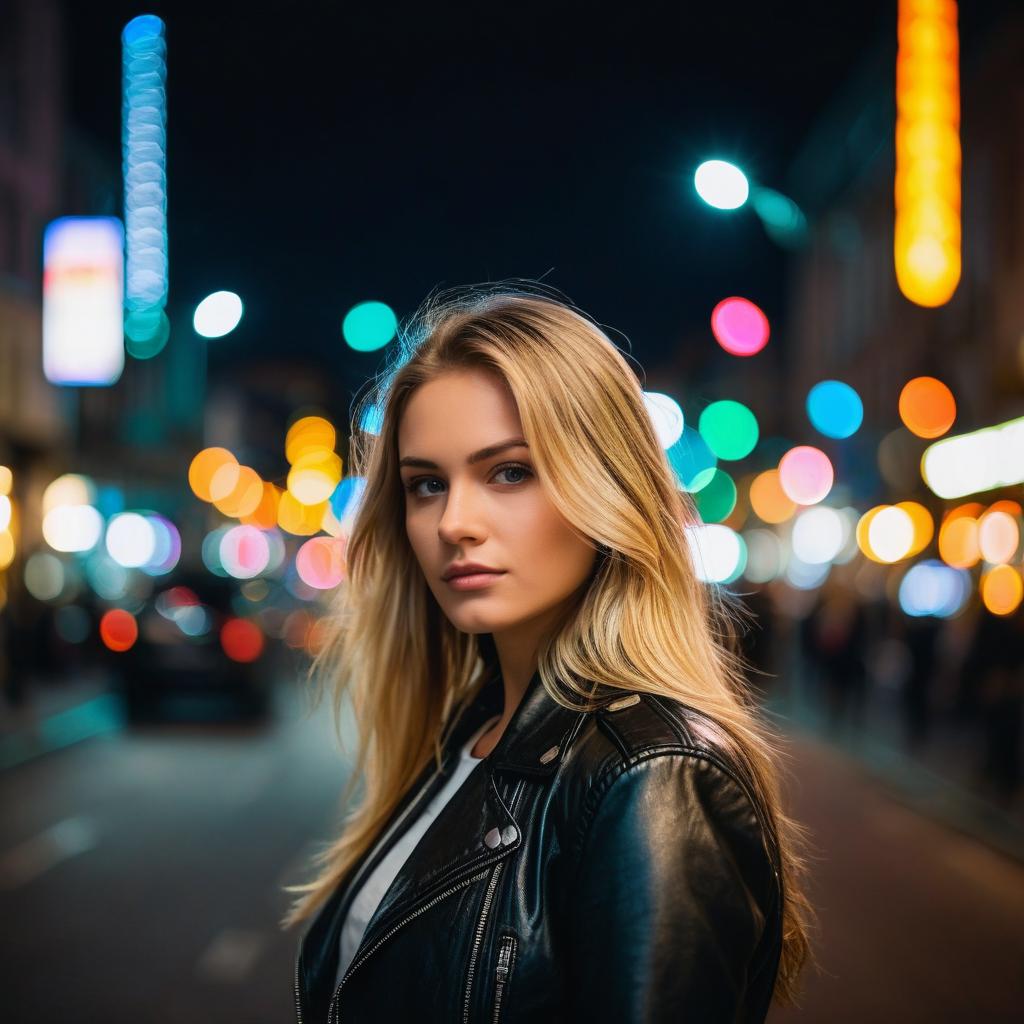 A stylish young woman with long blonde hair wearing a black leather jacket standing on a city street at night, surrounded by blurred colorful bokeh lights, cinematic portrait style, shallow depth of field, moody and warm lighting, urban background with streetlights and traffic signals, realistic photography