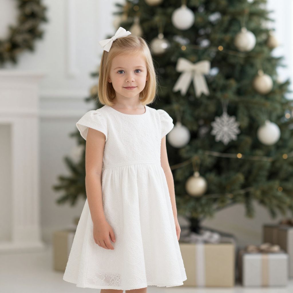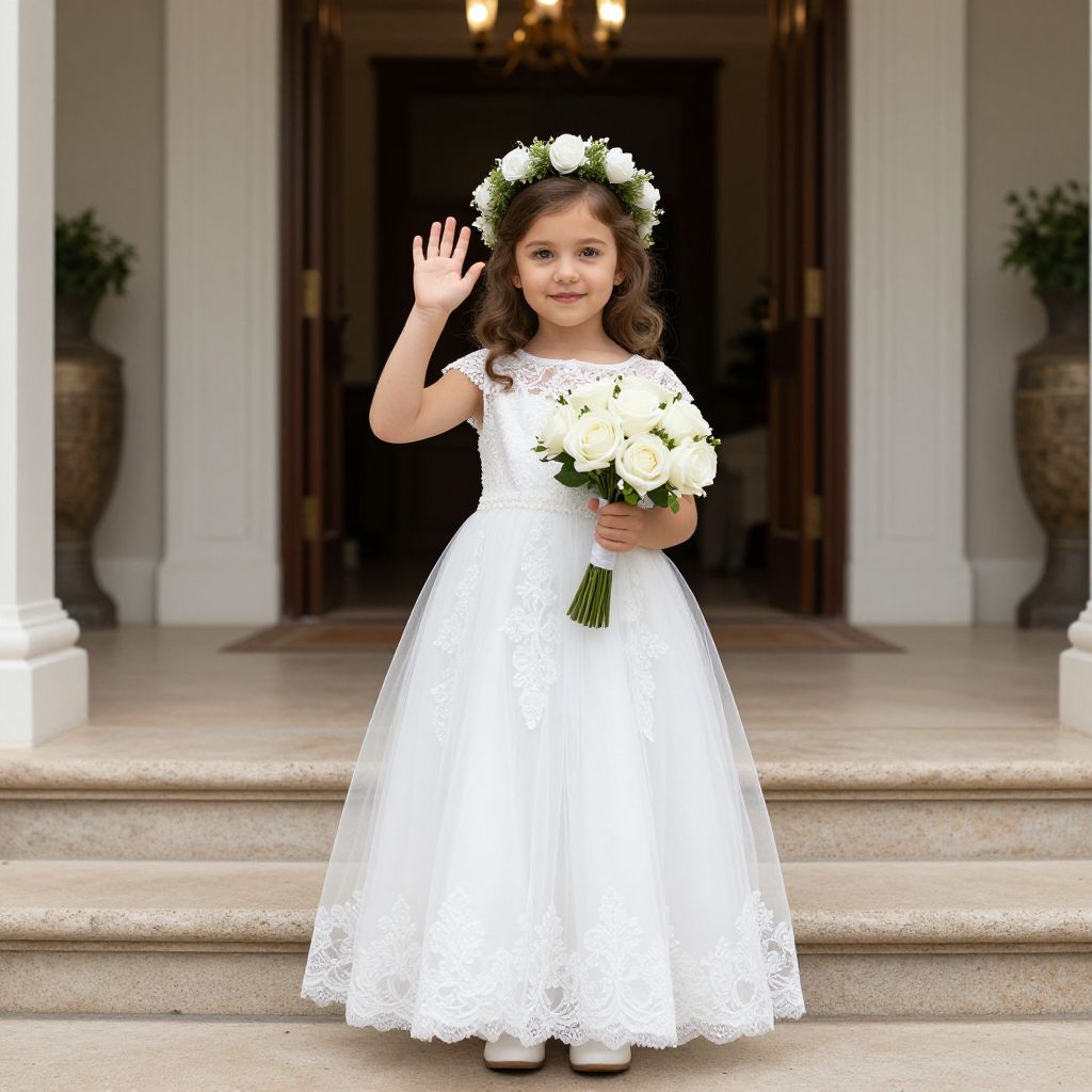 Radiant flower girl dressed in an elegant white lace and tulle gown, adorned with a floral crown, waves cheerfully while holding a bouquet of white roses, standing gracefully on stone steps before a grand entrance.