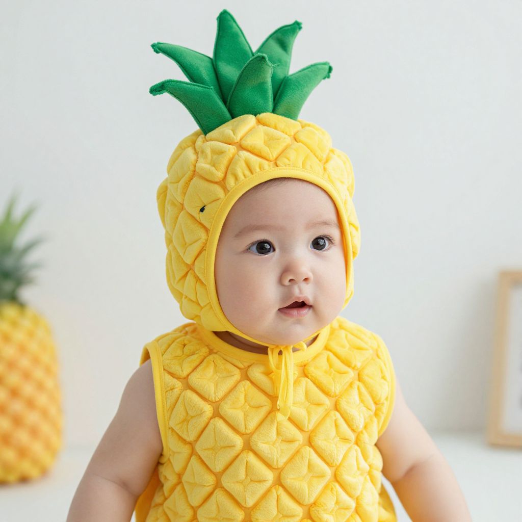 Photograph of a baby with light skin wearing a yellow pineapple costume with green leafy top, sitting against a bright white background, with a pineapple blurred