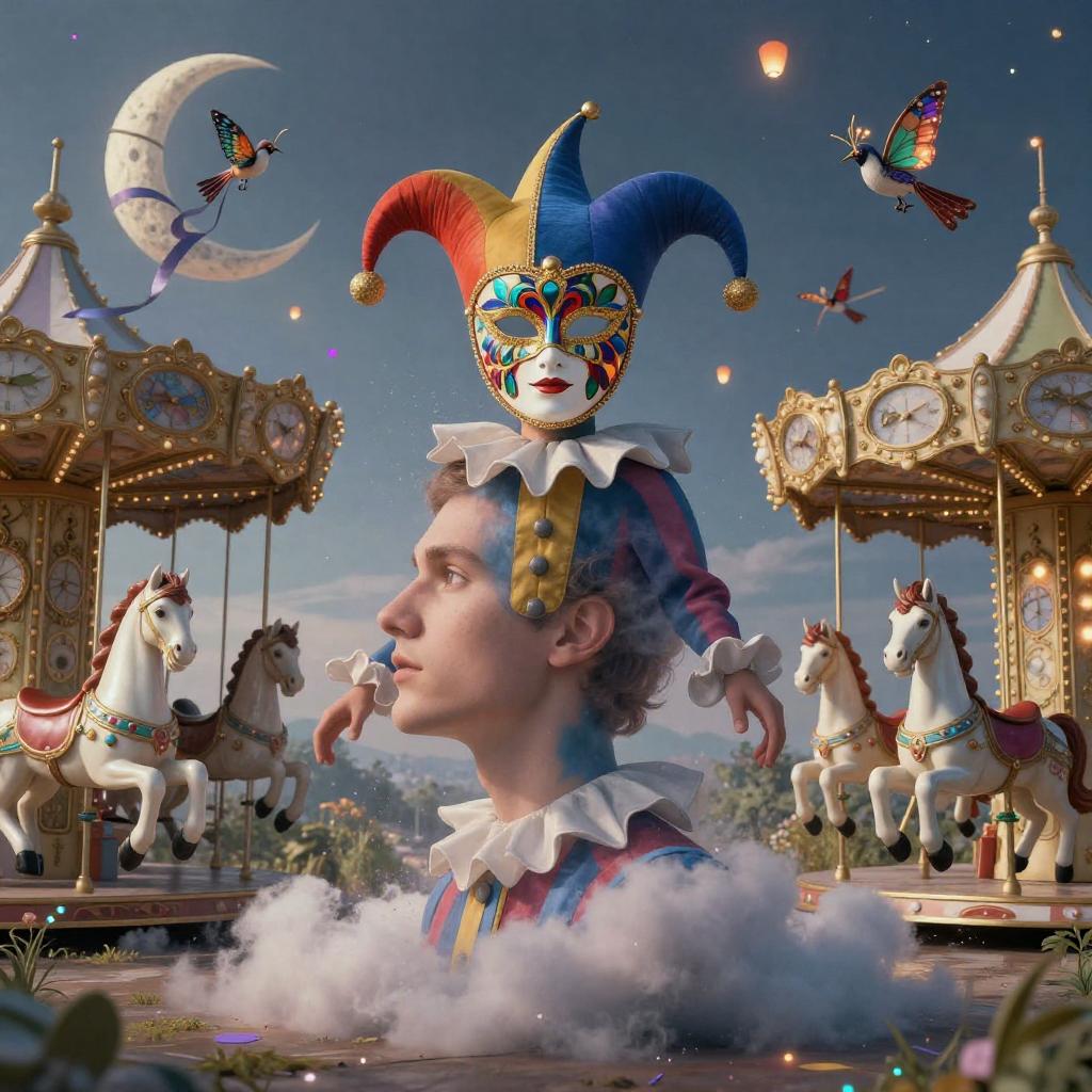 Realistic photo. Double Exposure Court jester (male)-Dream, kaleidoscope masquerade masks, floating carousel horses, ribboned moons, clockwork wind-up birds, glowing marionette butterflies, drifting confetti lanterns, whimsical fantasy, expressive creative art, surrealistic concept art, ethereal landscape in a cloud of magic coming out the top of a human head, incredible details, high-quality, flawless composition, masterpiece, highly detailed, photorealistic, 8k sharp focus quality surroundings realistic photo