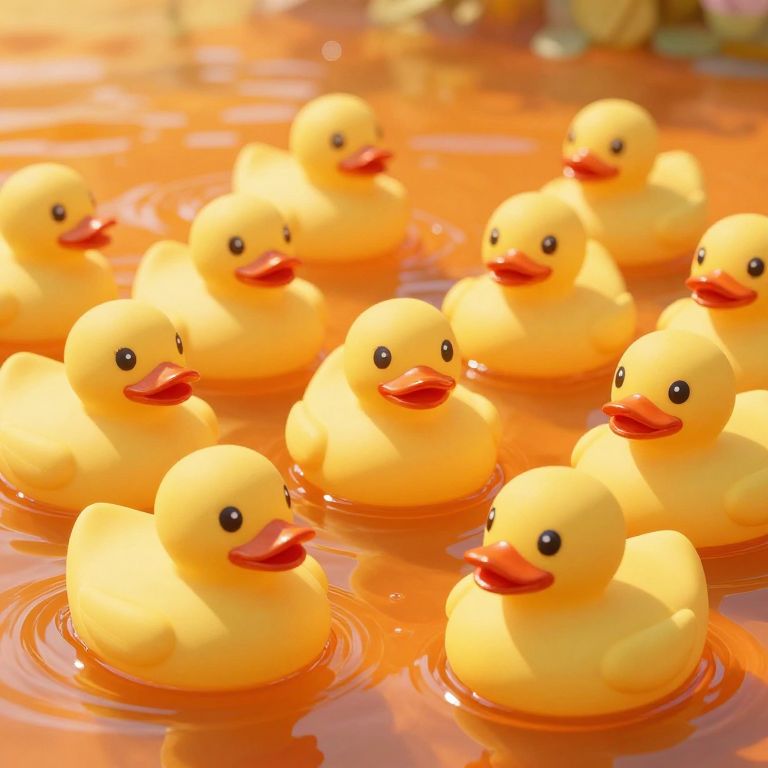 In a surreal tableau of unity and introspection, a vibrant assembly of rubber ducks floats serenely atop a pool of radiant orange liquid, their glossy eyes reflecting an inner dialogue on the nature of existence, while the ambient warmth and faint hum of their collective presence evoke a poignant sense of shared purpose amidst the ephemeral.