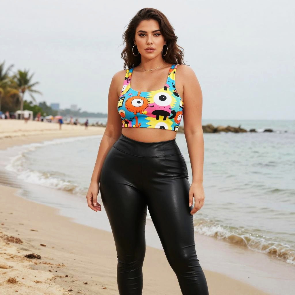 A Curvy woman in street style, wearing a colorful cartoon print crop top and black high-waisted faux leather leggings, stands on a hushed inlet with a sandy beach, captured in a vibrant production IG visual style. Sexy. Pretty face and beutiful eyes