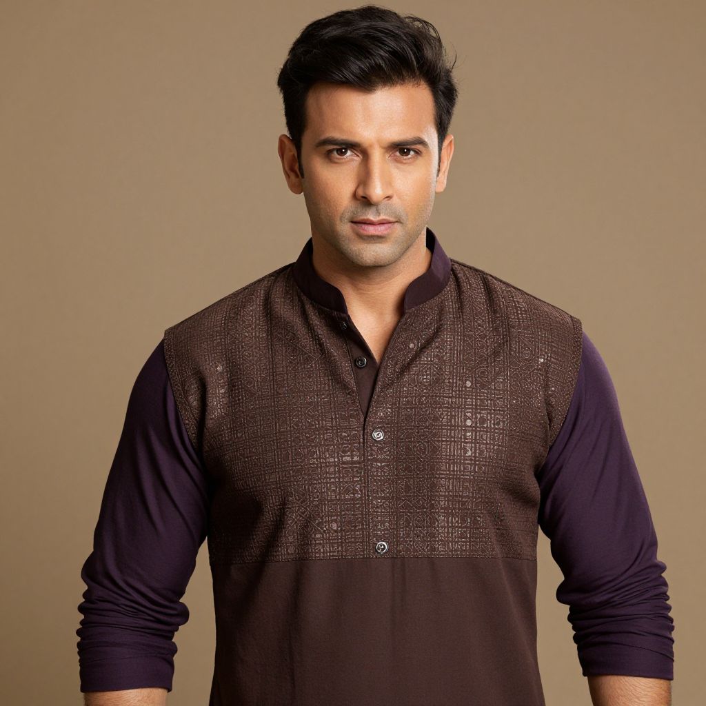 Photograph of a handsome Indian man with short black hair, medium skin tone, wearing a dark brown, textured, long-sleeve, button-up