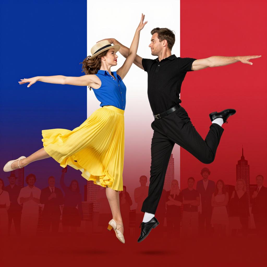 A dancing couple. Woman with fair skin, brown hair, wearing a blue sleeveless blouse, yellow pleated skirt, straw hat, and beige shoes. Man with fair skin, brown hair, wearing black polo shirt, black pants, white socks, and black shoes. Both mid-leap, arms outstretched. Background with French flag colors and faint crowd. Woman's hand on hat, man's hand open. Red background lower section with crowd silhouettes.