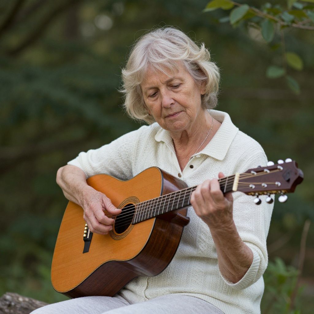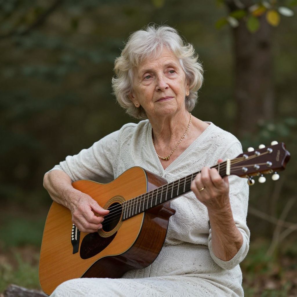 Photograph of an elderly woman with short gray hair, wearing a white lace blouse, playing an acoustic guitar outdoors in a forest.