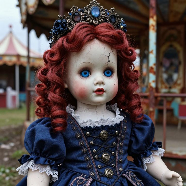 Close-up of a haunted porcelain doll with cracked skin and eerie blue eyes, dressed in an elaborate dark blue gothic dress with lace and metal embellishments. The doll has red curly hair styled in ringlets and a dark crown with floral designs. The background features an abandoned carnival setting with rusted metal structures, enhancing the dark fantasy atmosphere.