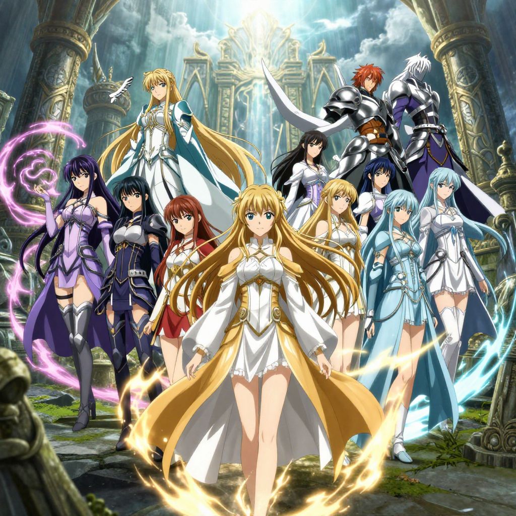 Digital anime artwork of four fierce, scantily clad female warriors with swords, in an ancient, ruined temple, battling amidst smoke.