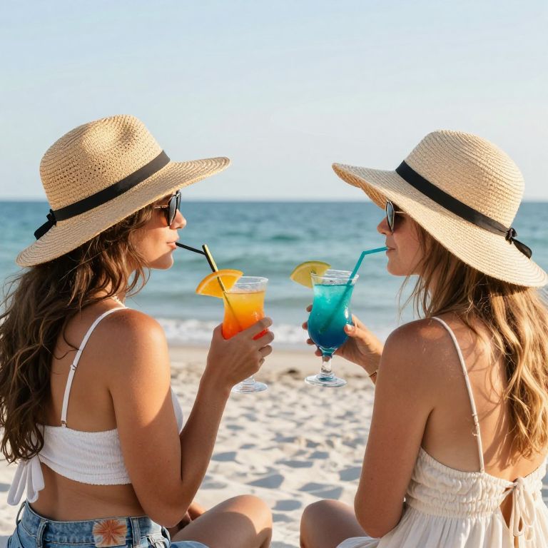 Two individuals enjoying colorful cocktails by the ocean, both wearing wide-brimmed hats and summer attire, exuding a carefree vibe against the backdrop of a serene Naples, Florida beach.