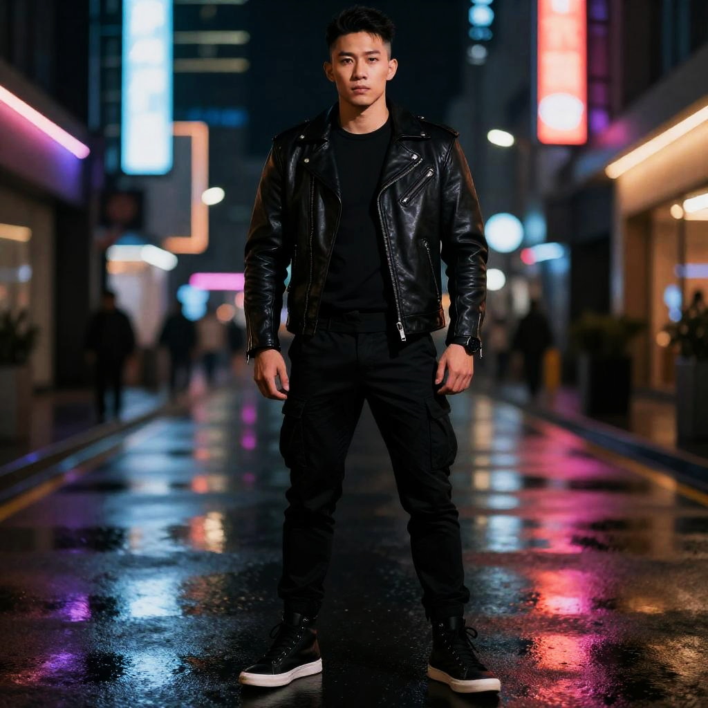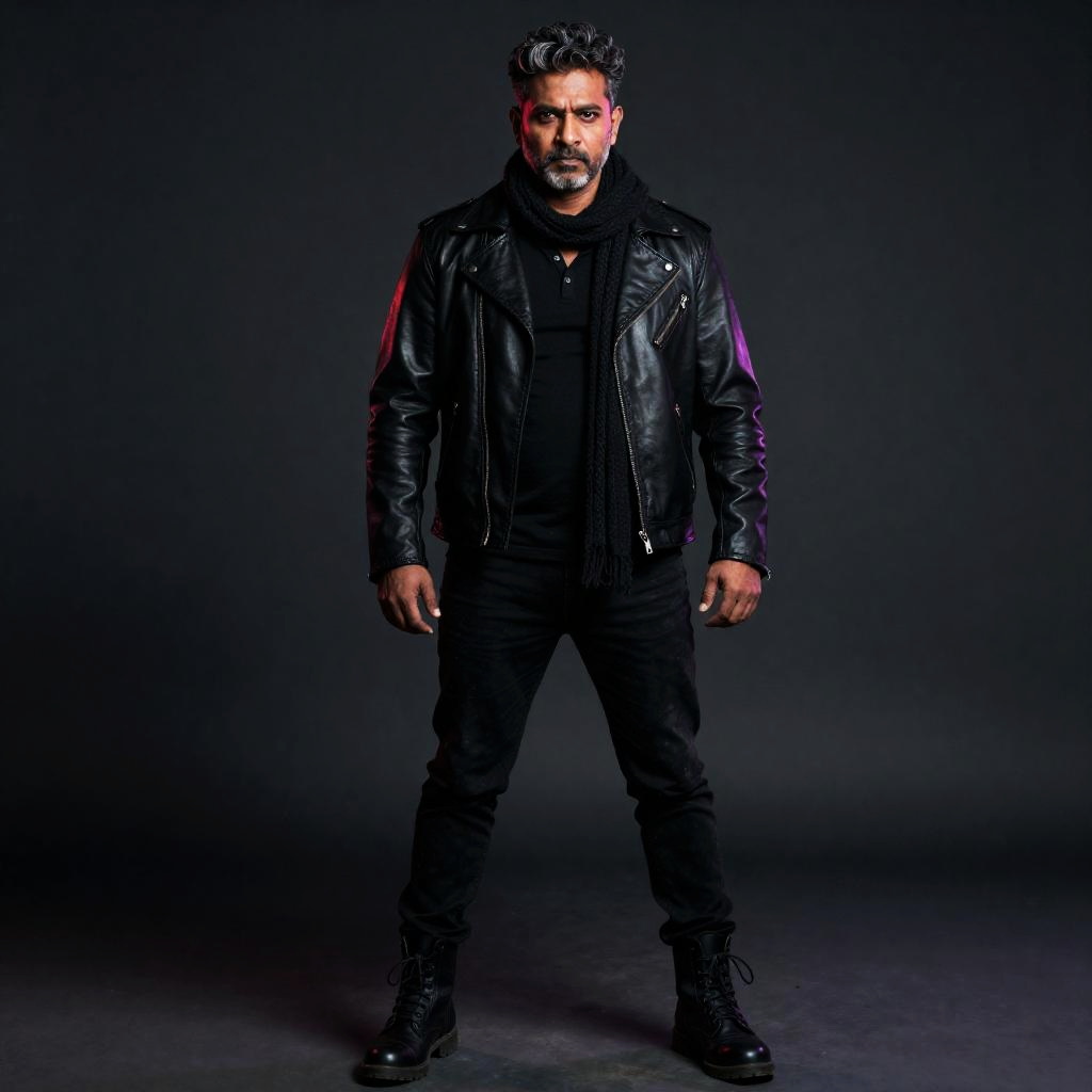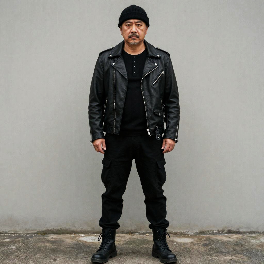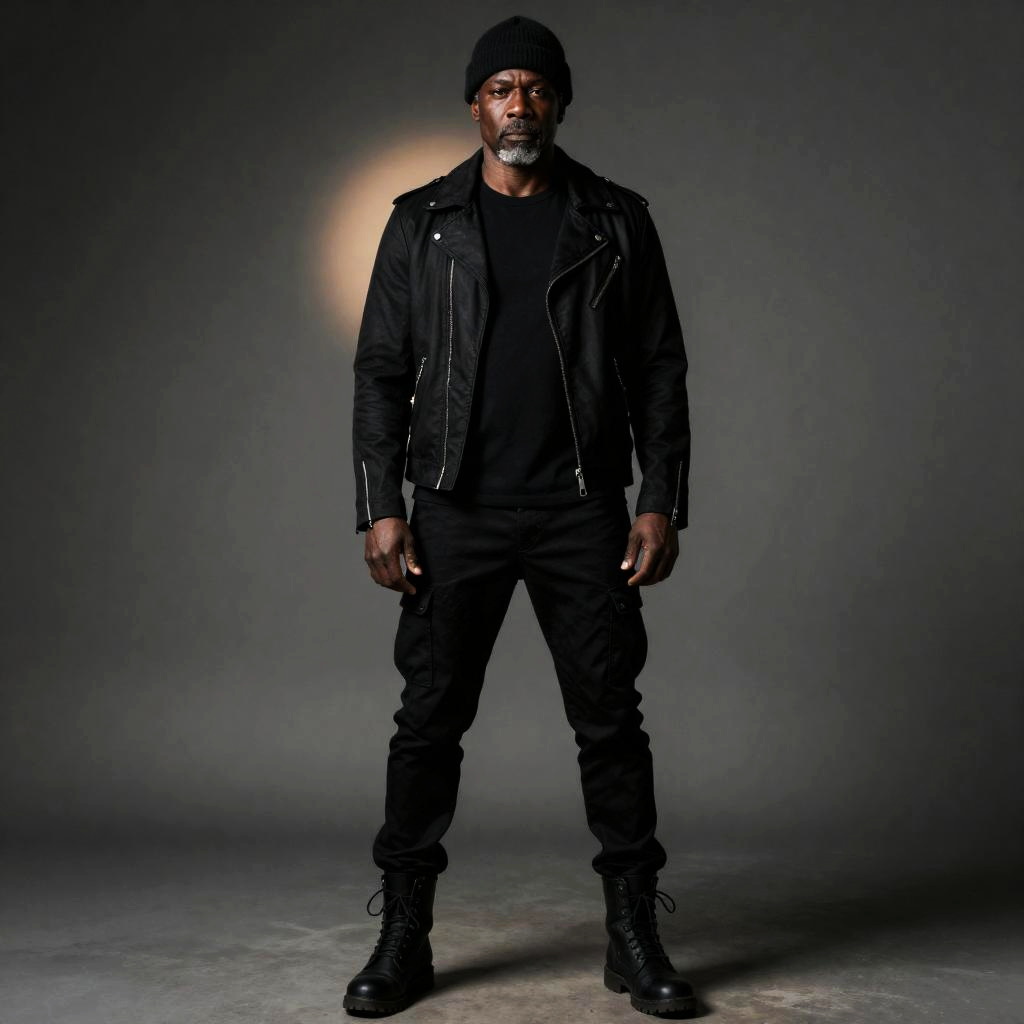 Middle-aged Black man, Muscular physique, Close-cropped salt-and-pepper curls, all black outfit men, matte black moto jacket with black merino crew tee, black tapered utility pants, black lace-up combat boots and a black knit beanie, gritty urban realism, muted desaturated palette with soft rim backlight