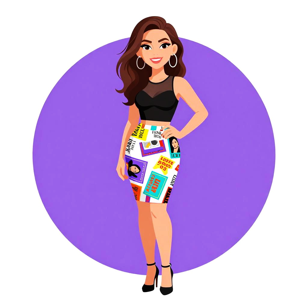 Digital cartoon illustration of a confident woman with long, wavy brown hair, fair skin, and large brown eyes. She wears a form-fitting, black and white lace-patterned dress that accentuates her curvy figure, and black high heels. She stands with one hand on her hip, smiling. The background features a solid purple circle, creating a bold contrast. Her makeup is subtle, with a hint of pink lipstick. The style is vibrant and exaggerated, with a playful, cartoonish aesthetic.