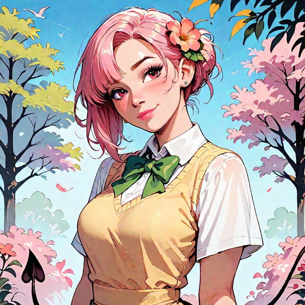 Score_9, score_8_up, score_7_up, source_anime, sailorjupiter, brown hair, circlet, green eyes, hair bobbles, hair ornament, medium hair, ponytail, sidelocks, parted bangs, back bow, bow, bowtie, brooch, choker, earrings, elbow gloves, flower earrings, gem, gloves, green choker, green gemstone, green sailor collar, green skirt, jewelry, miniskirt, pink bow, pink bowtie, pleated skirt, sailor collar, shirt, short sleeves, skirt, white gloves, white shirt, outdoors, cityscape, looking at viewer