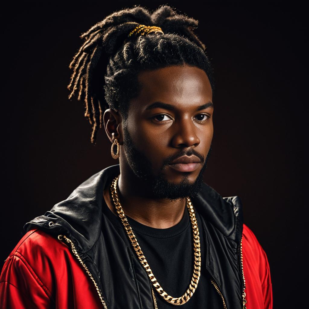 Afro ponytail man,jewelry, 1boy, male focus, solo, earrings, necklace, facial hair, shirt, looking at viewer, red jacket, realistic, black hair, dreadlocks, dark-skinned male, jacket, black shirt, upper body, open clothes, beard, dark skin, brown background, gold chain