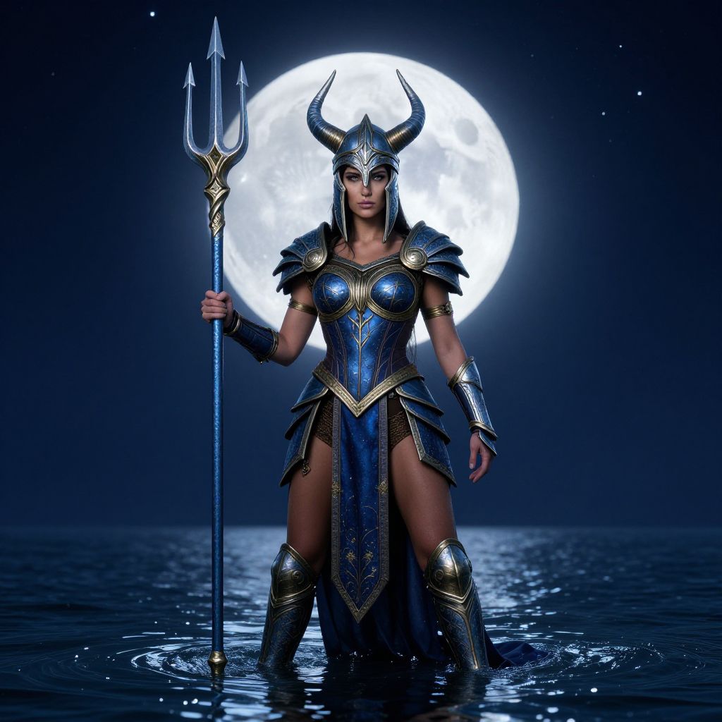 A powerful woman warrior stands knee-deep in water under a starry night sky with a large full moon glowing behind her. She is adorned in ornate blue and gold armor, holding a tall trident and wearing a distinctive horned helmet, embodying a fantasy or mythological theme with a heroic and mystical atmosphere.