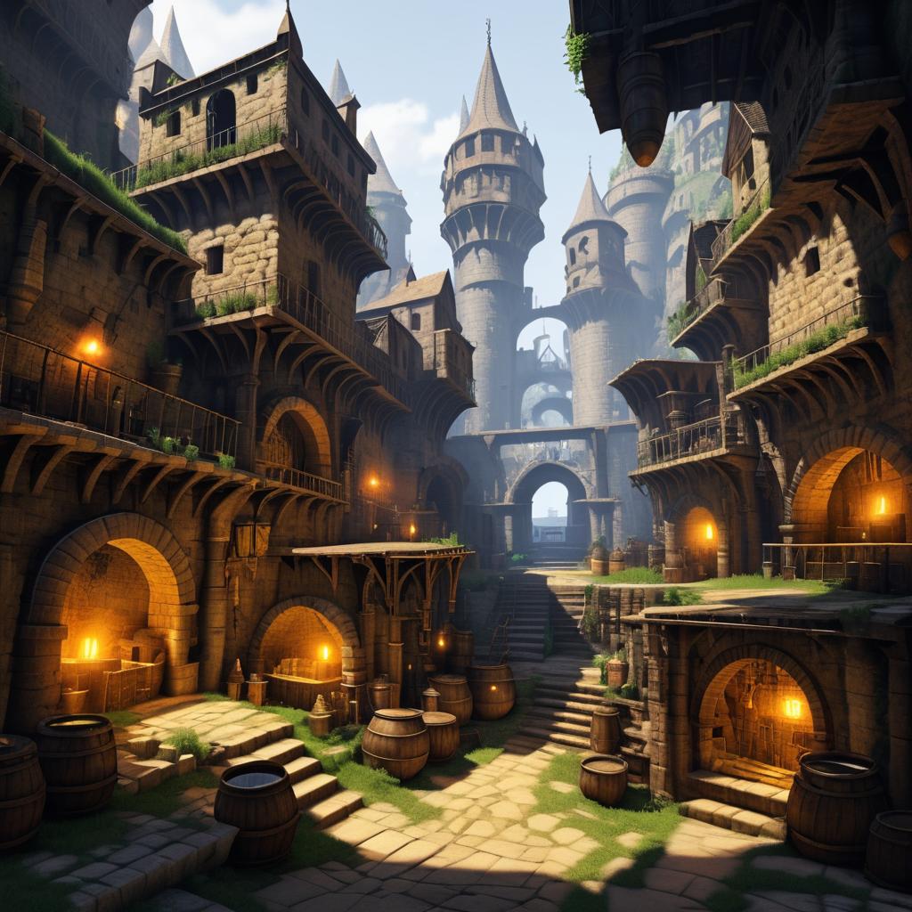 A detailed medieval fantasy underground slum featuring stone buildings with arched doorways and towers. The area is lit by warm glowing lights and filled with wooden barrels and stairs. The architecture includes engineered technologies, gears, and automations suggestive of mining, filtration, and drug production uses, set in a complex, moody environment.