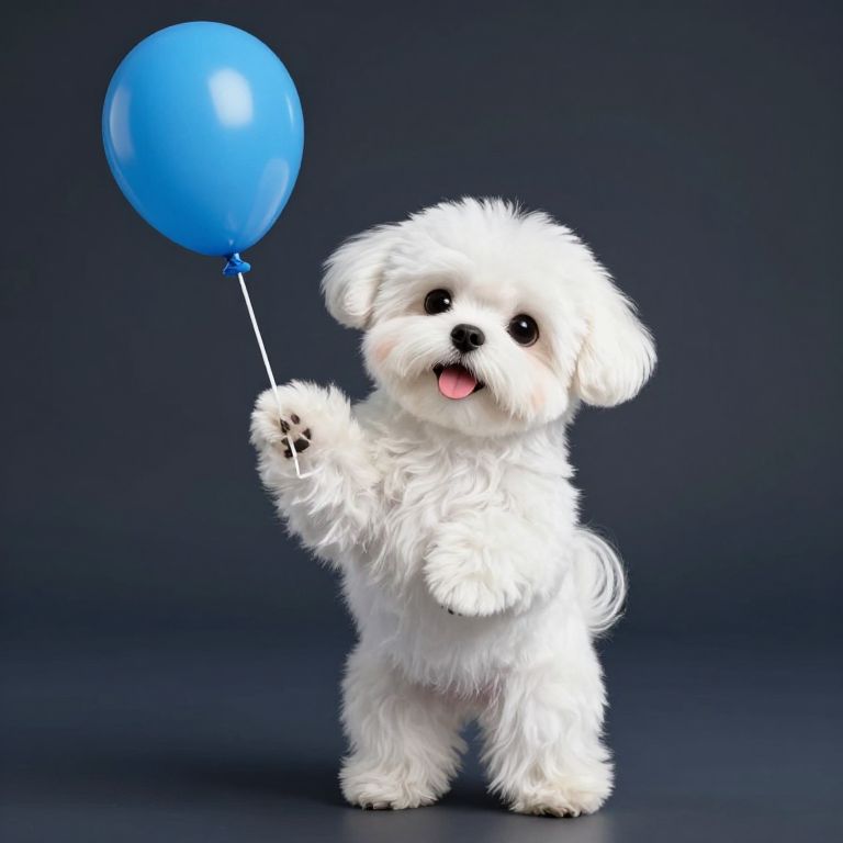 Small cute funny white maltese bologna stands on its hind legs and stretches up its front paw, female with on the left gives the bologna a blue balloon, 3d, kodak 50mm lens, professional photoshoot, full-hight scene view