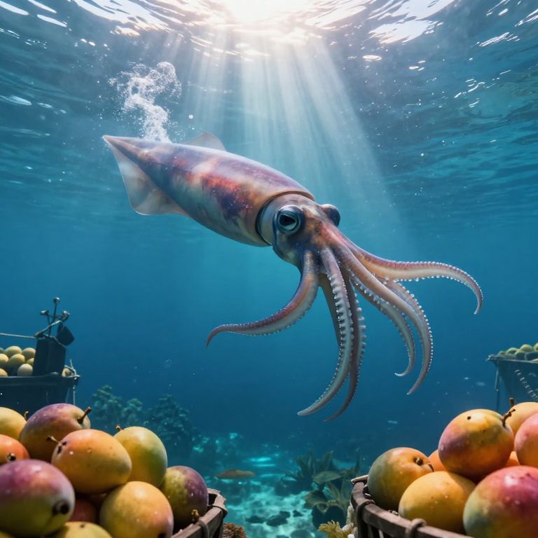In a surreal aquatic realm where the veil between worlds thins, a colossal squid hovers serenely above a floating market, exchanging cosmic whispers for the vibrant hues of fresh mangoes, as the ethereal glow of sunlight filters through the depths, weaving a tapestry of wonder and mystery.