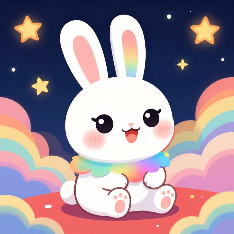 A colorful, digital cartoon of a cute white bunny with big, shiny eyes and pink blush on its cheeks. The bunny has rainbow-colored ears and a fluffy, multicolored neck fur. It sits on a red hill surrounded by swirling, rainbow-colored clouds and a starry night sky filled with bright orange and yellow stars. The background is dark blue, adding contrast. The bunny looks adorable and joyful.