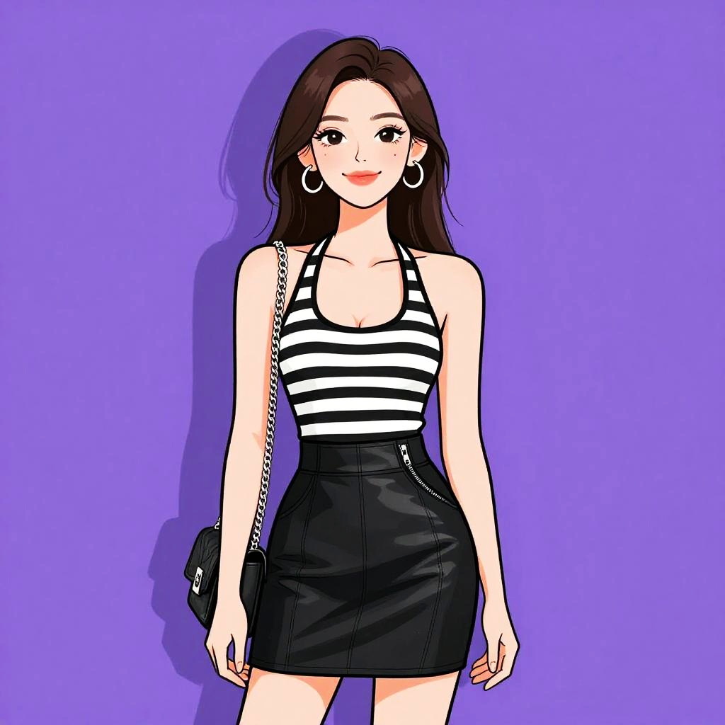 Woman with pretty face and pretty hair. smiling Woman, edgy, black leather crop top with high neckline, sleeveless, abstract monochrome flared skirt, above-knee length, white structured shoulder bag with chain strap, oversized round sunglasses with dark lenses. --sref 1467