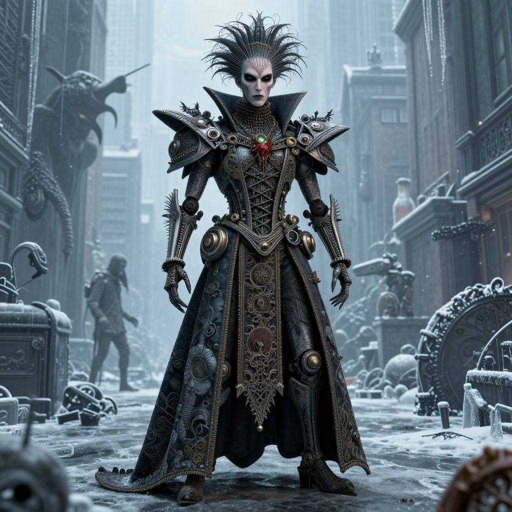 A gothic, punk-style man in intricate, hypermaximalist, ornate clothing with a machine-like appearance stands in a cityscape, evoking the styles of Ernst Haeckel, Charles Audubon, H.R. Giger, Moebius, and Beeple, with a frozen, ominous, and haunting atmosphere created using Cinema 4D and CGSociety techniques.