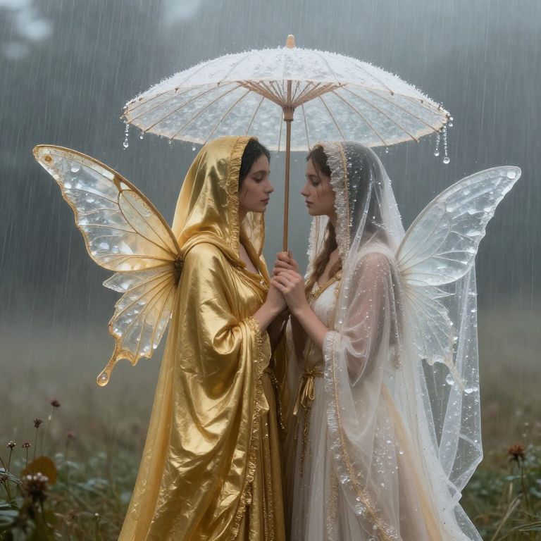 Photograph of two women standing in a rainy, misty field, sharing a transparent umbrella adorned with sparkling beads. Both wear delicate, translucent fairy wings and veils. The woman on the left has medium skin and dark hair, dressed in a shimmering gold robe. The woman on the right has fair skin and light brown hair, wearing a pale, lacey dress with a sheer veil. The golden robe and white dress contrast beautifully against the rainy background. The image exudes a magical, ethereal quality, emphasizing the women's fairytale-like appearance. The background is blurred, focusing attention on the two figures.