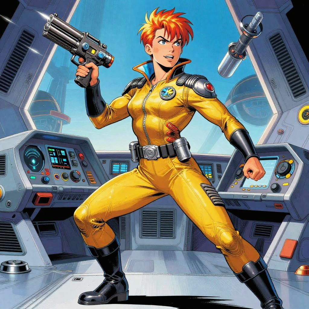 Bucky O'Hare Jenny character vibrant sci-fi pilot suit, futuristic spaceship cockpit background, dynamic pose with blaster, comic book art style, bold colors, high detail