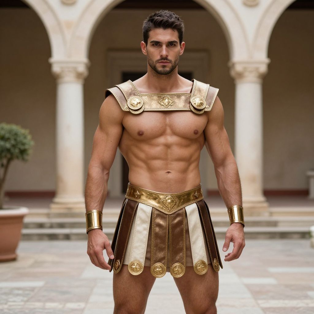 Muscle Costume Boy, a shirtless man in a roman costume standing in a courtyard