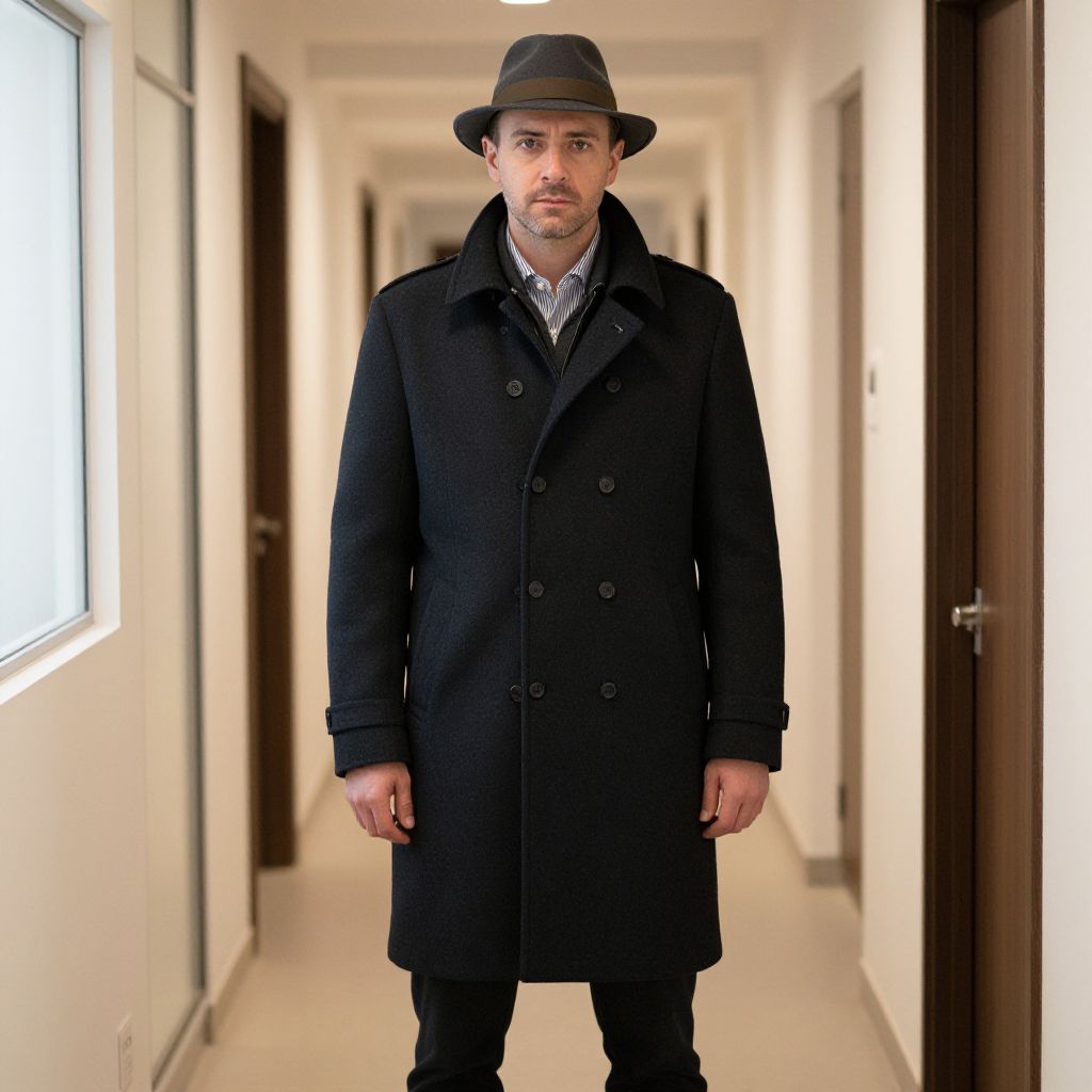 "Winter Wear Office Man, man in a coat and hat standing in a hallway"