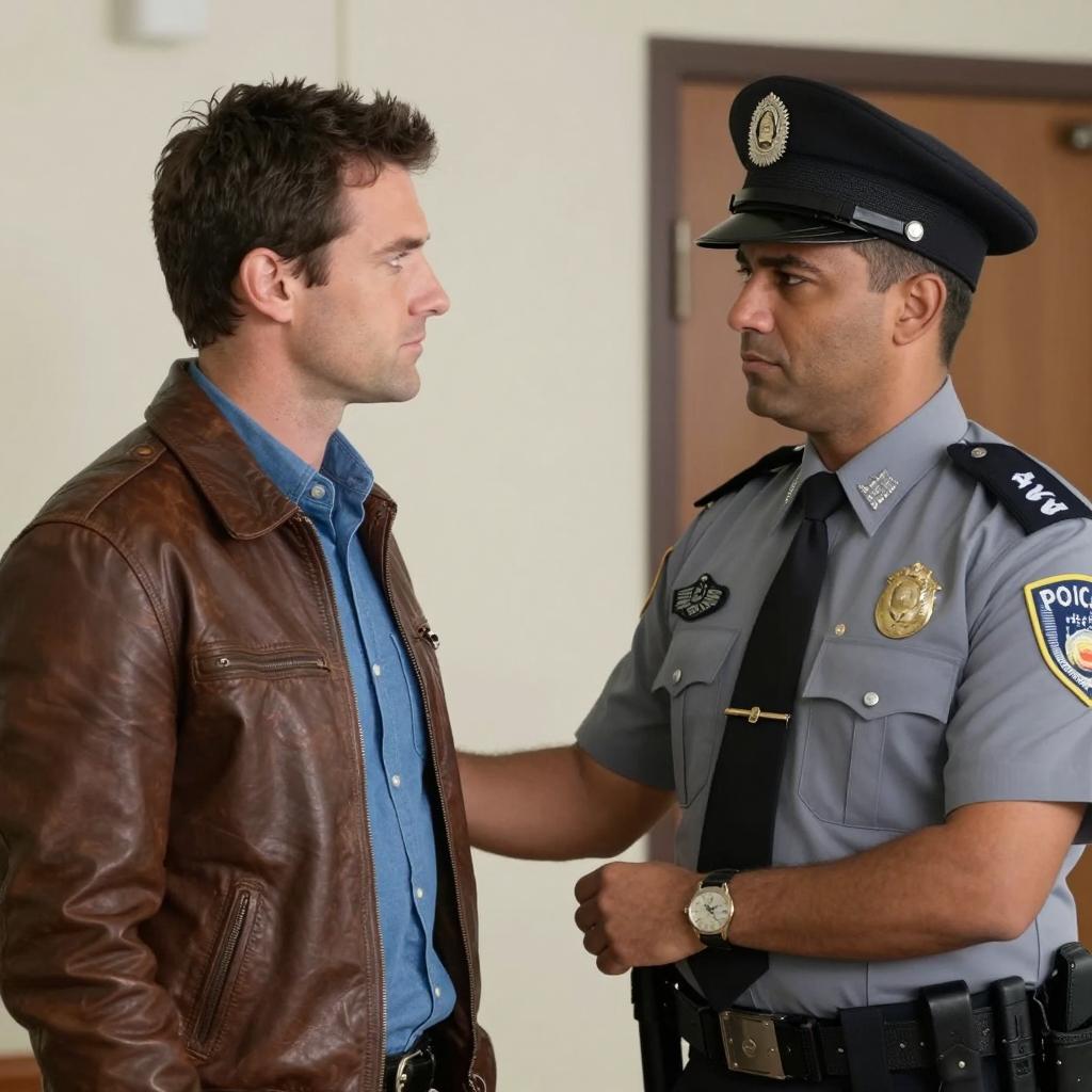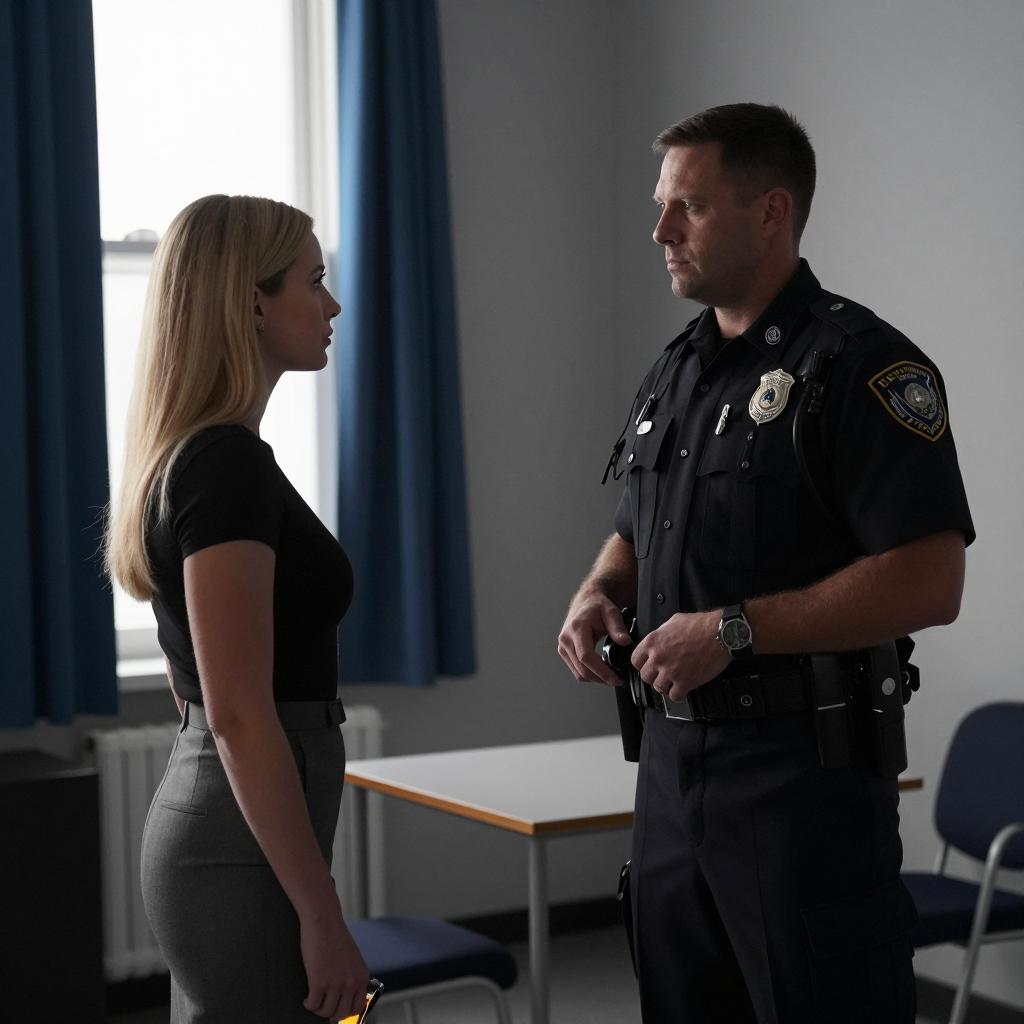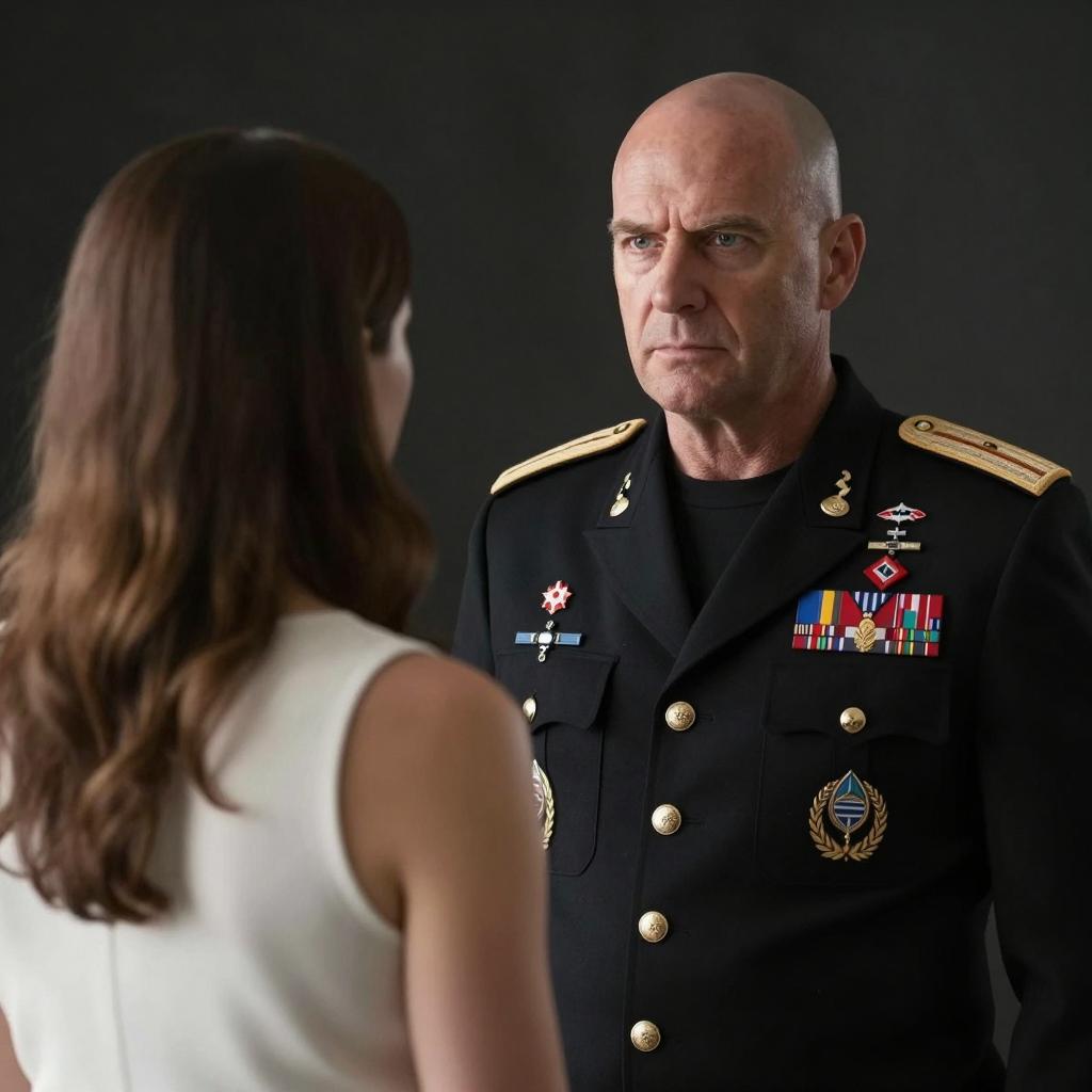 Man in dark military uniform with red shoulder straps, black tie, and badge number 5498, speaking to a woman with blonde hair, facing away. Office setting with water cooler, phone, and wooden walls in background. Man has short brown hair, intense expression, mouth slightly open. Woman's hair is straight, blonde, visible from back. Two people.