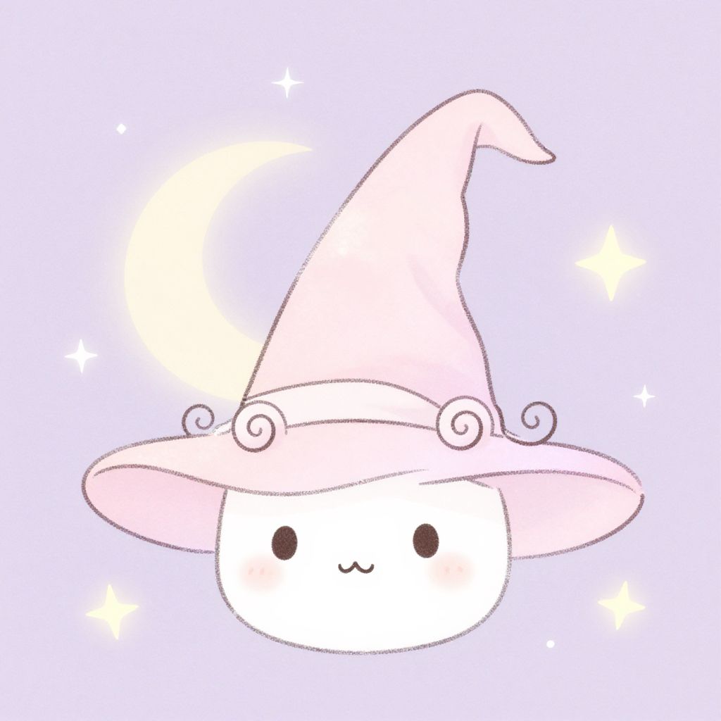 Cute witch hat drawing, whimsical and charming style, soft pastel colors, delicate line art with playful curls on the brim, surrounded by tiny sparkling stars and moonlight, magical and friendly atmosphere, suitable for children’s book illustration