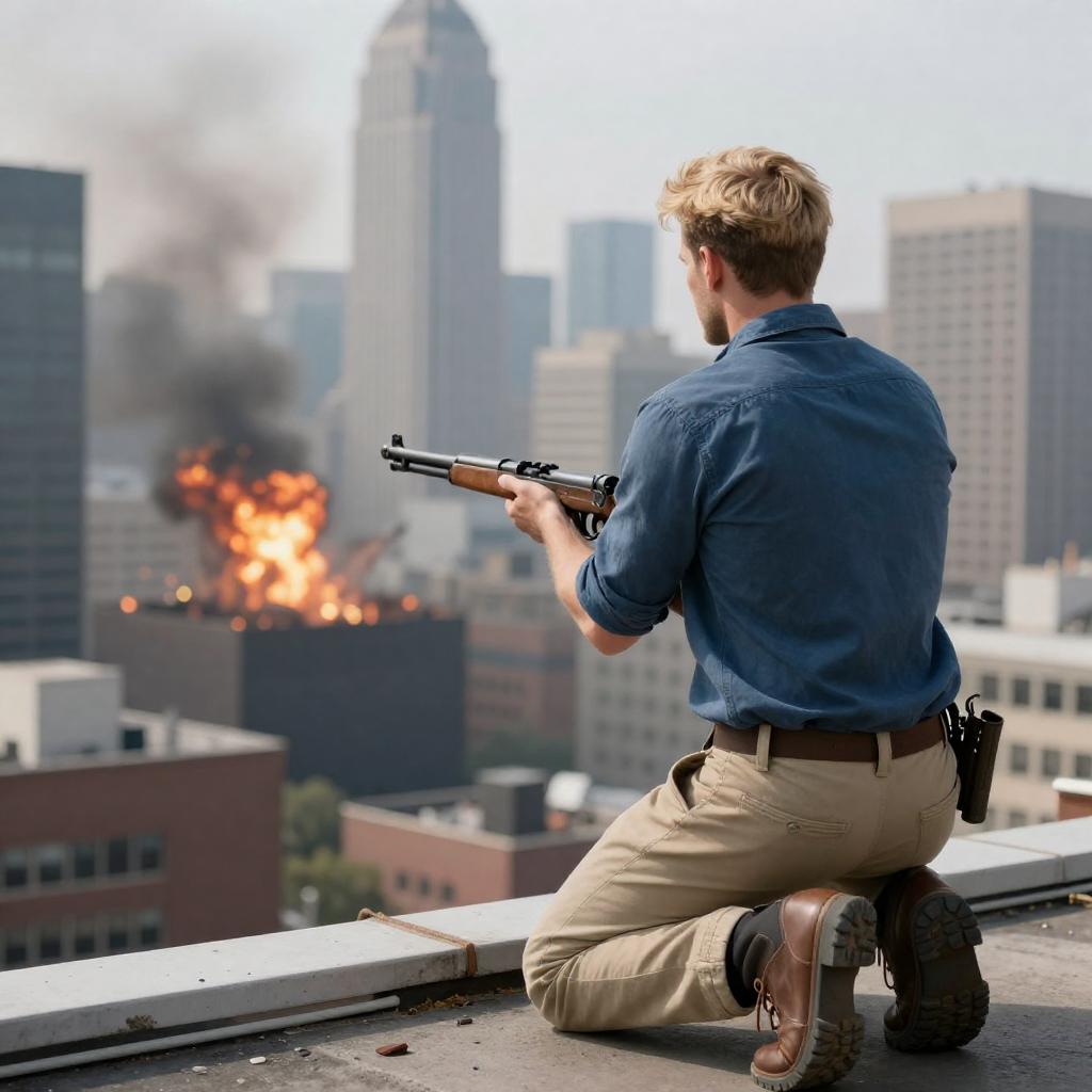 Man with blonde hair, blue shirt, beige pants, and brown boots kneels on rooftop ledge, holding rifle, looking at cityscape. Cityscape has tall skyscrapers, explosions, smoke, and debris. Man's back to viewer, intense gaze at city. Daylight, overcast sky.