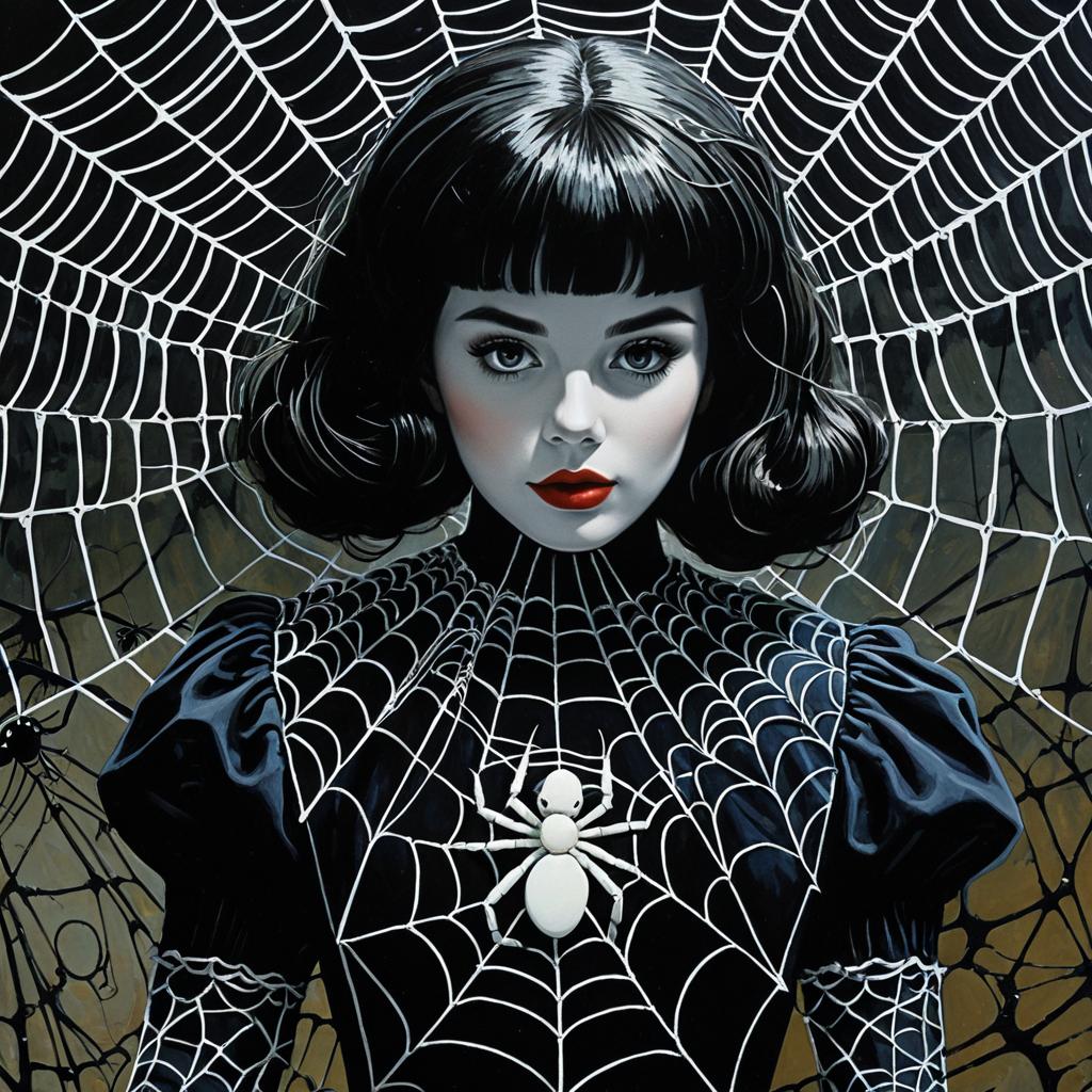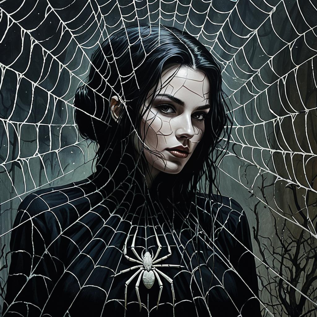 A beautiful yet terrifying close-up painting of a haunting scarecrow entangled in a spider web. Styled with influences from Keith Parkinson, Basil Gogos, Moebius, Alphonse Mucha. The artwork is intricate and gothic, with detailed textures that evoke a haunting atmosphere. The painting captures a mix of dark beauty and eerie elegance, blending classic and modern styles with hyper-detailed brushwork.