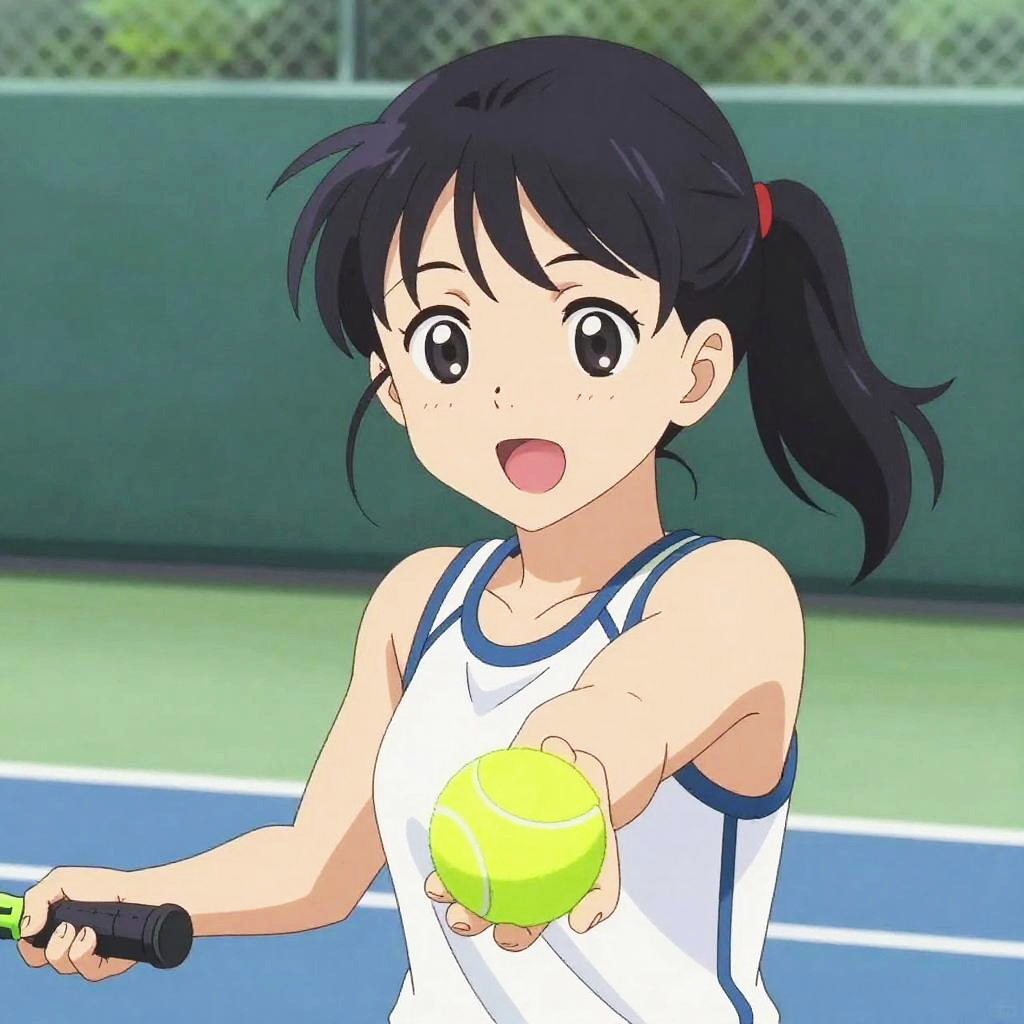Close-up of an anime girl playing tennis, sweat on her face as she concentrates, vivid green tennis court with blurred crowd in the background, intense yet graceful pose, colorful sports attire, rendered in sharp detailed anime art with dramatic lighting.