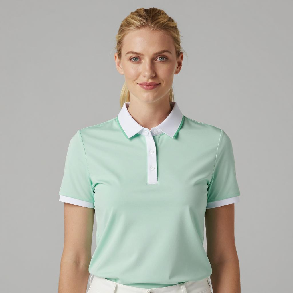 Woman fun golf clothes, photorealistic portrait of a blonde woman with fair skin, wearing a light green polo shirt with white collar and cuffs, standing against a plain grey background, short hair in a simple ponytail, soft makeup, slight smile, upper body shot, studio lighting, casual fashion, slightly shiny ure on the shirt, relaxed and confident expression
