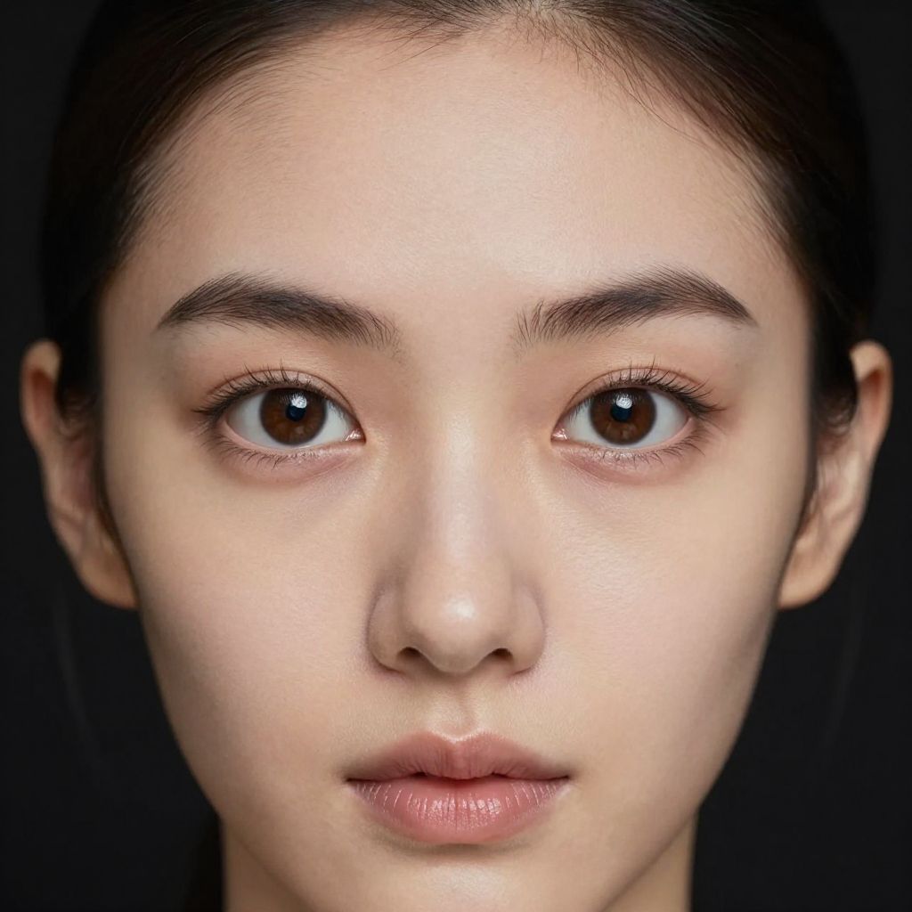 Close-up photograph of an Asian woman with fair skin, dark brown eyes, and straight black hair, against a black background.