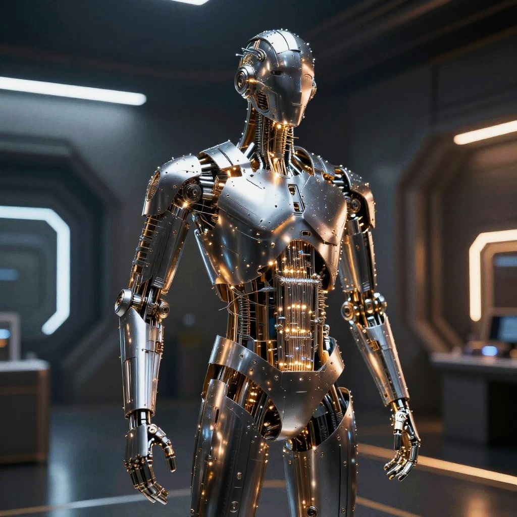 Futuristic AI Steel Humanoid Sculpture