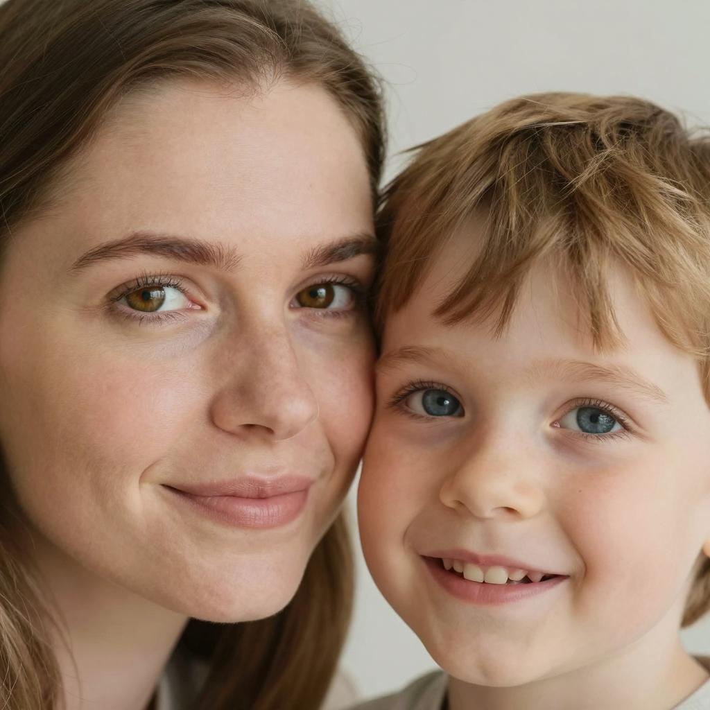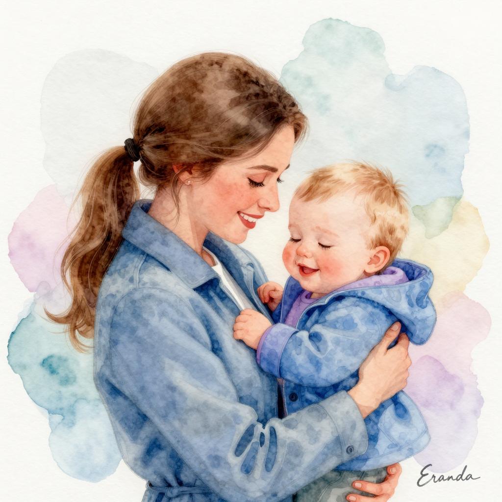 Illustration of a mother and baby, close-up. Mother with red-brown hair, blue shirt, resting head on baby's head. Baby with light brown hair, blue eyes, white shirt, slightly smiling. Intense, intimate expressions. Brushstroke style with vivid colors. Mother's head slightly tilted, baby's face upper right. Both eyes looking forward.