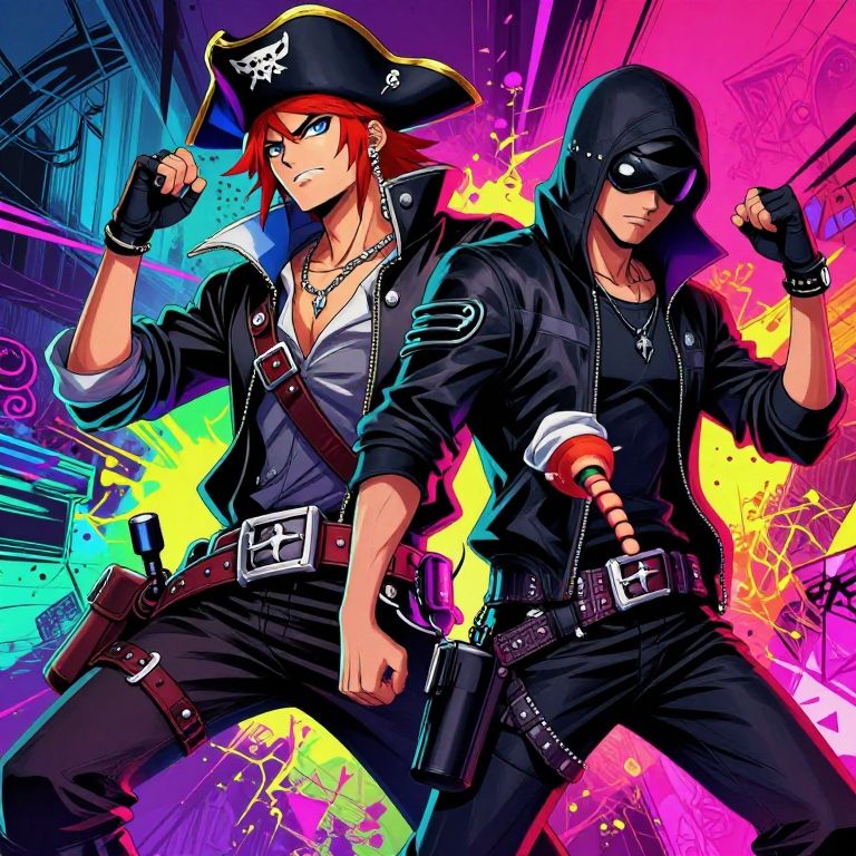 A cyberpunk-themed illustration featuring a pirate and hacker, both in action poses, with vibrant neon colors and graffiti art elements, showcasing a manga art style reminiscent of Trigger Studio.