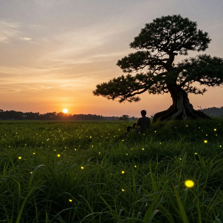 Augmentation twilight fireflies in a lush field vibrant sunset with a nice place to sit under a bonsai tree block print dark greens brown beige pastel yellow,