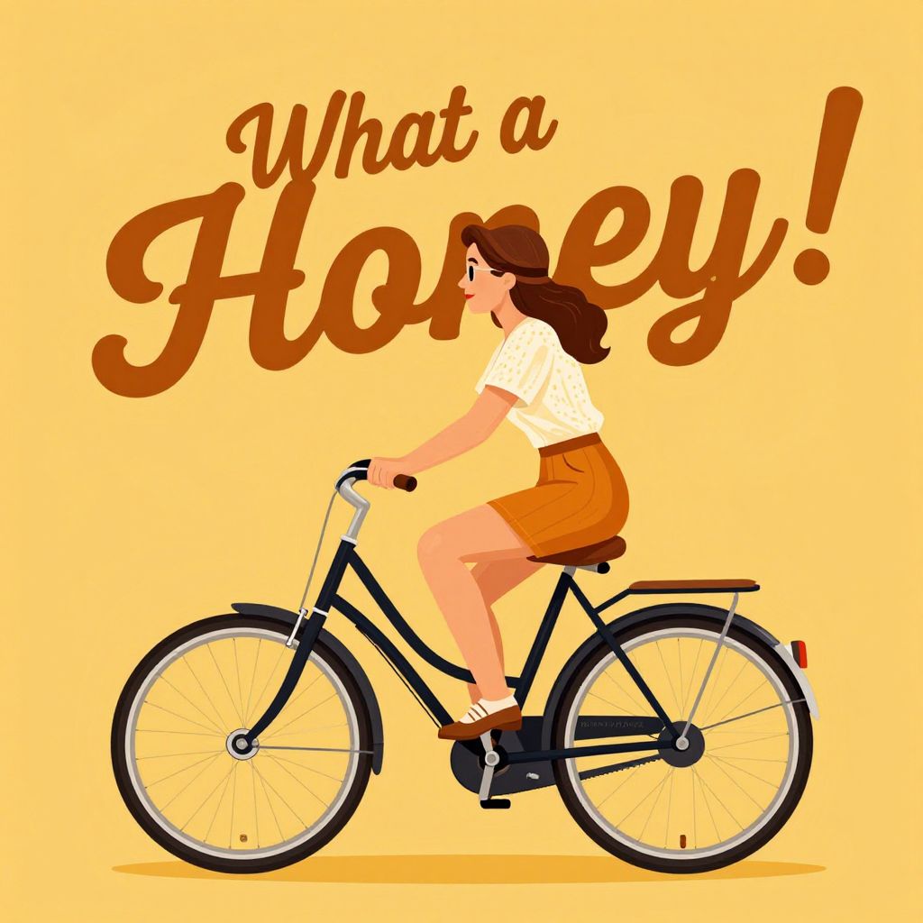 Illustration of a woman with brown hair in a white shirt and orange skirt riding a black bicycle on a yellow background with "What a Honey!" text