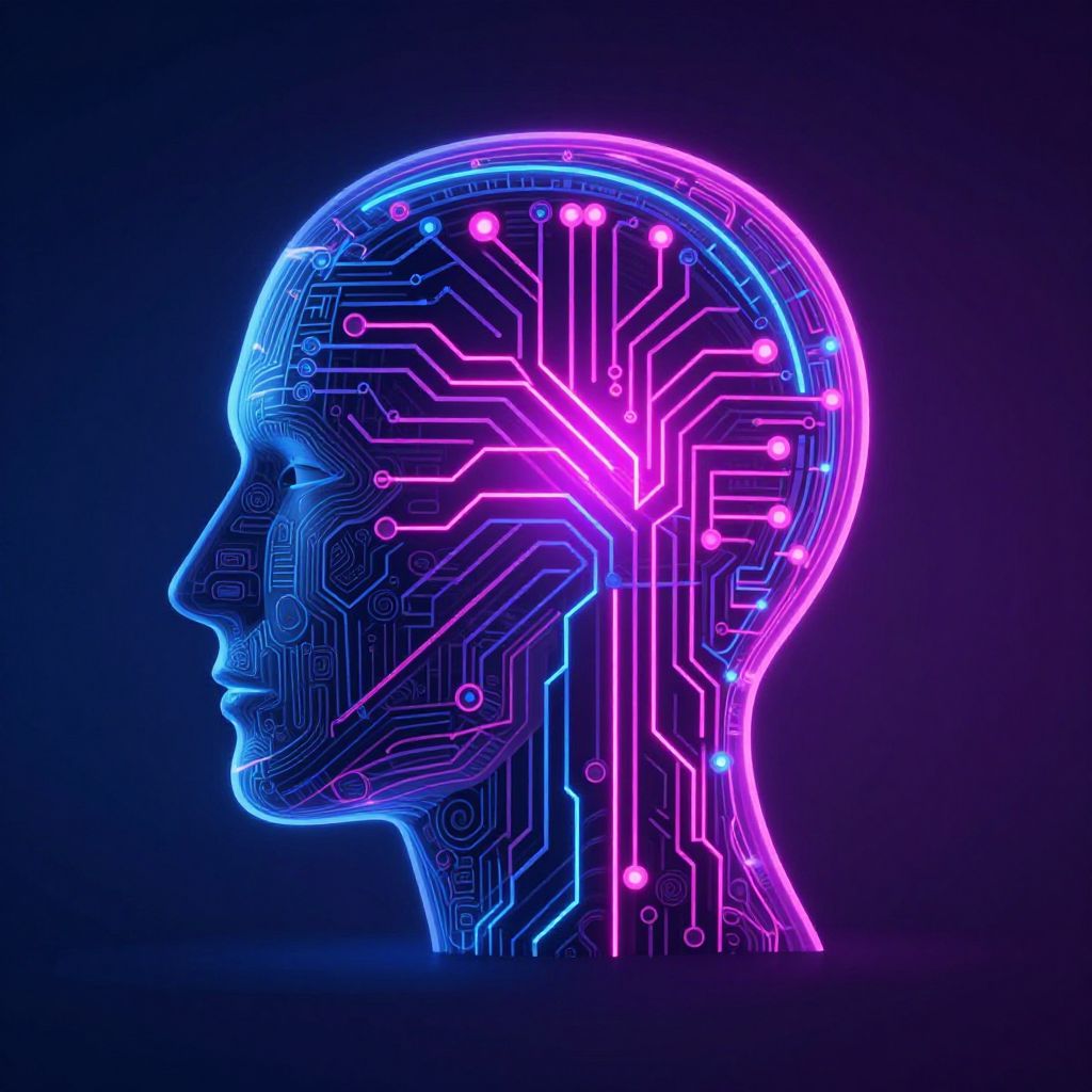 Prfile digital identity illustration, stylized human head composed of interconnected circuits and neon lines, glowing effects, tech-inspired color palette of deep blues and bright magentas, modern graphic design aesthetic
