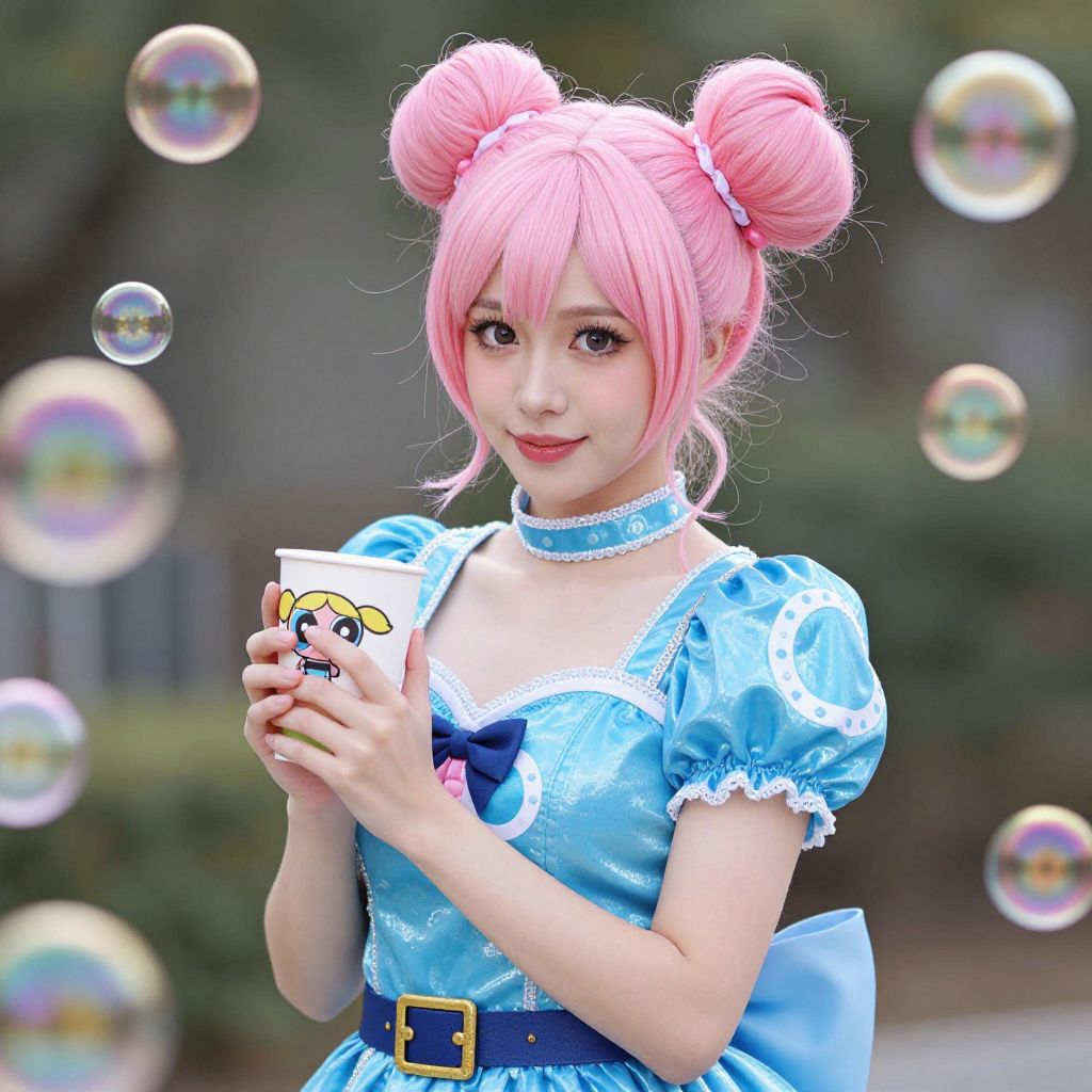 A woman dressed in a highly detailed cosplay costume inspired by Bubbles from the Powerpuff Girls, featuring bright pink hair styled in large buns and a shiny blue outfit with circular patterns. She holds a cup while surrounded by floating bubbles, creating a whimsical and vibrant scene with a realistic photographic style.